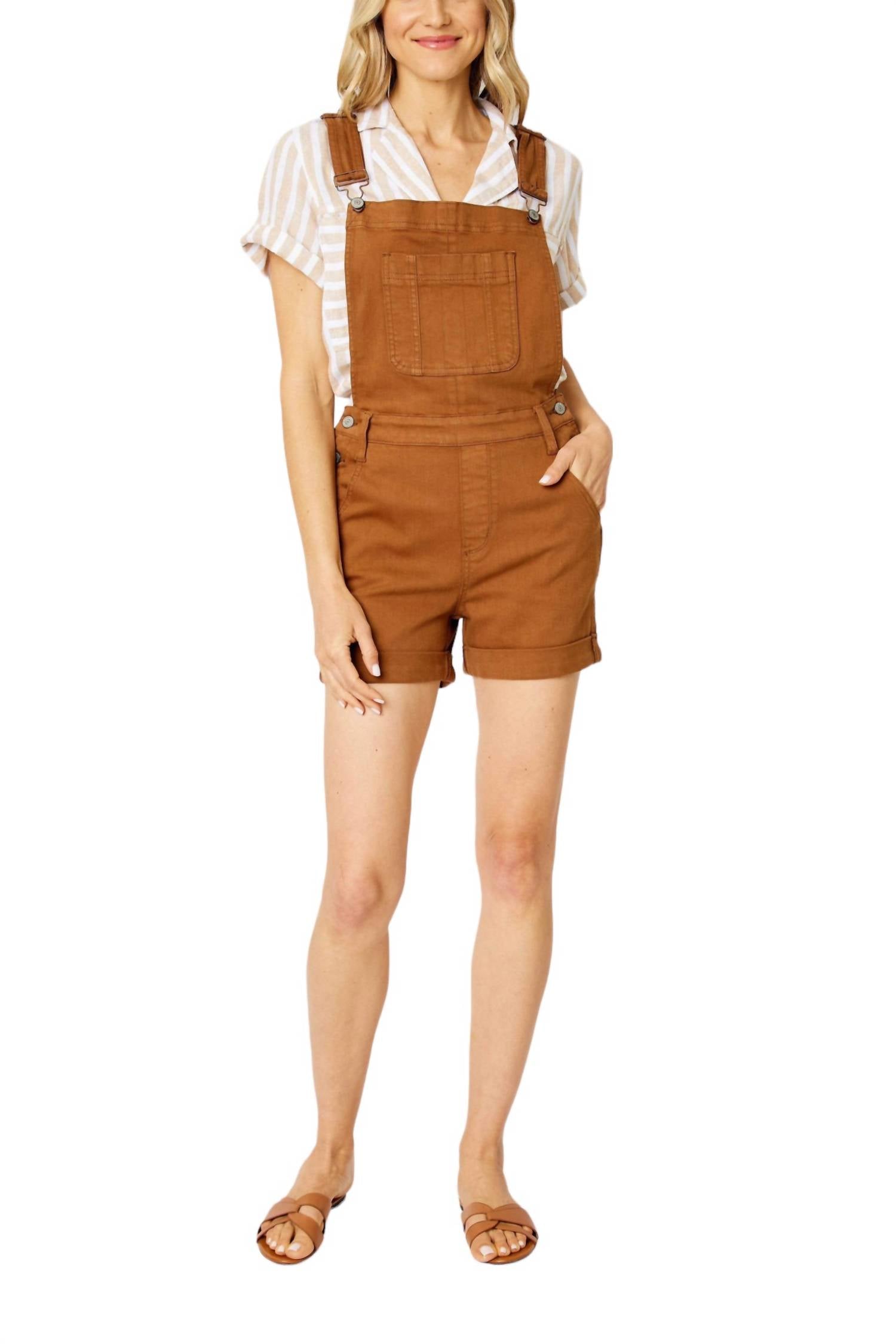 These brown denim short overalls feature a front bib pocket, adjustable shoulder straps, and side button closures for a secure fit. They have rolled hems and side pockets for added functionality. Fabric: 93% Cotton, 6% Polyester, 1% Spandex. True to size.