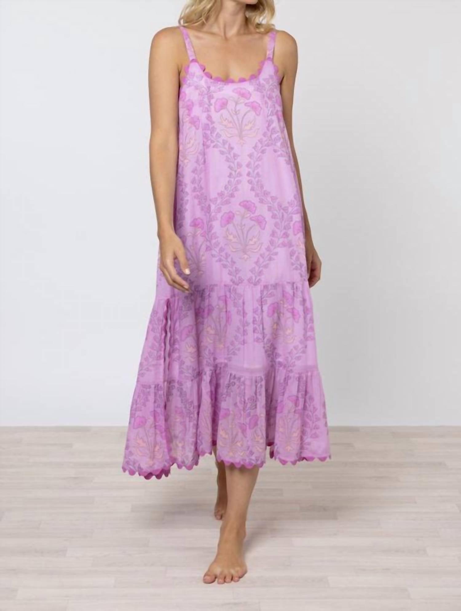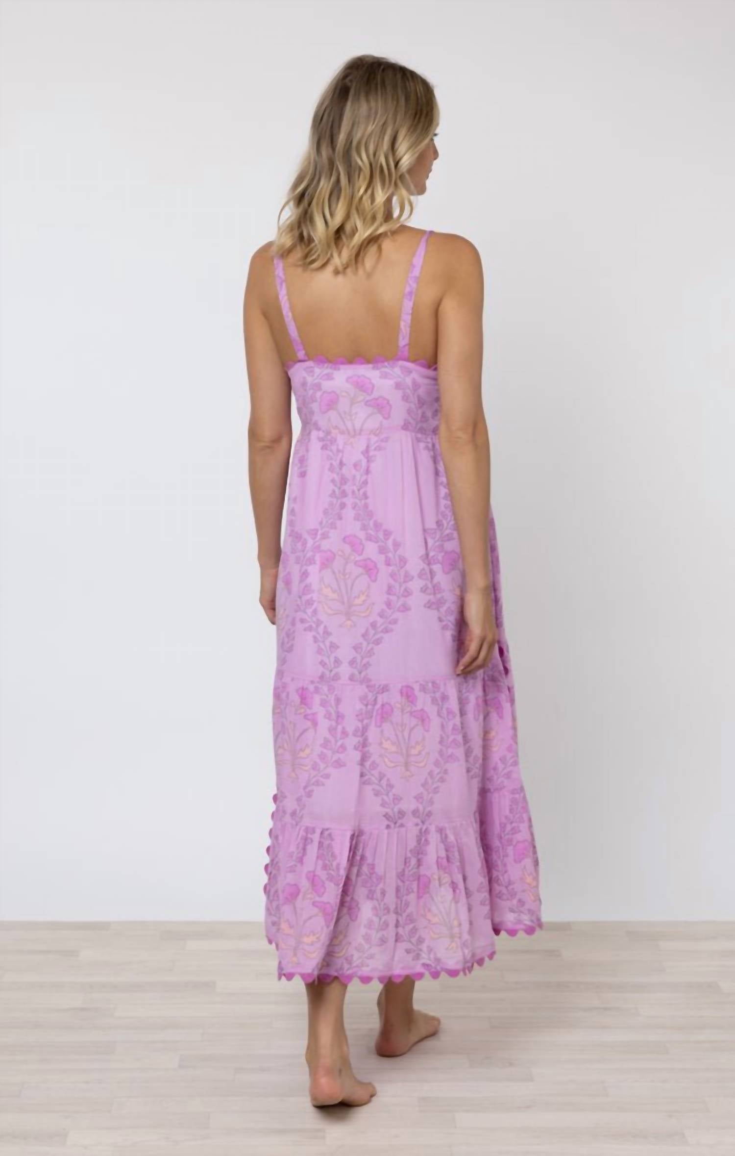 Introducing the Swing Tiered Midi Dress by Juliet Dunn, a boho chic staple perfect for your vacation wardrobe. This spaghetti strap dress, in a charming pastel violet with hand-block printed peach floral design, offers a delightful ric-rac finish at the hem, split, and scoop neckline. Crafted from 100% cotton, this midi-length, tiered, sleeveless dress features a knee-high split for elegant movement. Closure: Pull-on style.