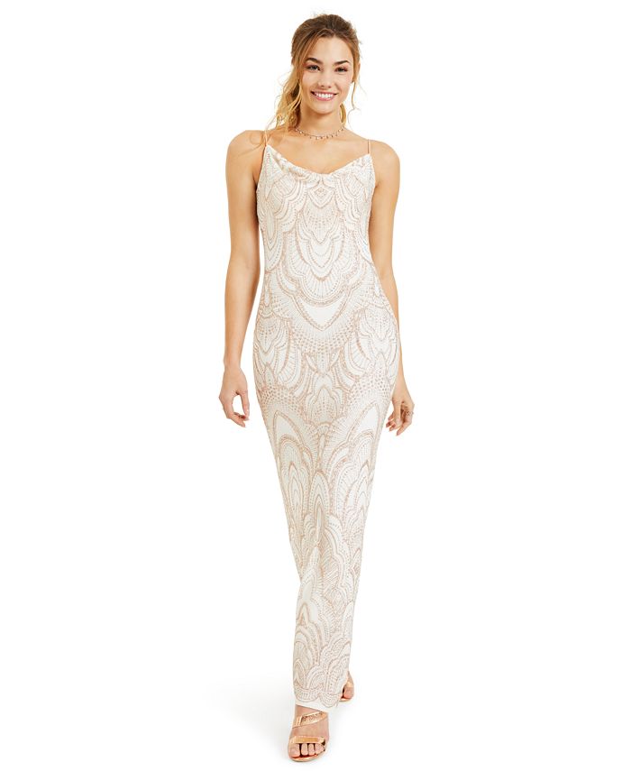 A gorgeous allover glitter pattern evokes instant all-out glamour with this slinky draped-neck formal gown from Jump. | Approx. 49 long from center back neck to hem. Length is based on size 7/8 and varies 1/4 between sizes| Runs true to size; order your normal size| Floor-length formal dress| Glitter-knit; Stretchy and comfortable with inlaid glitter| Drape neckline; Gown silhouette| Pullover styling