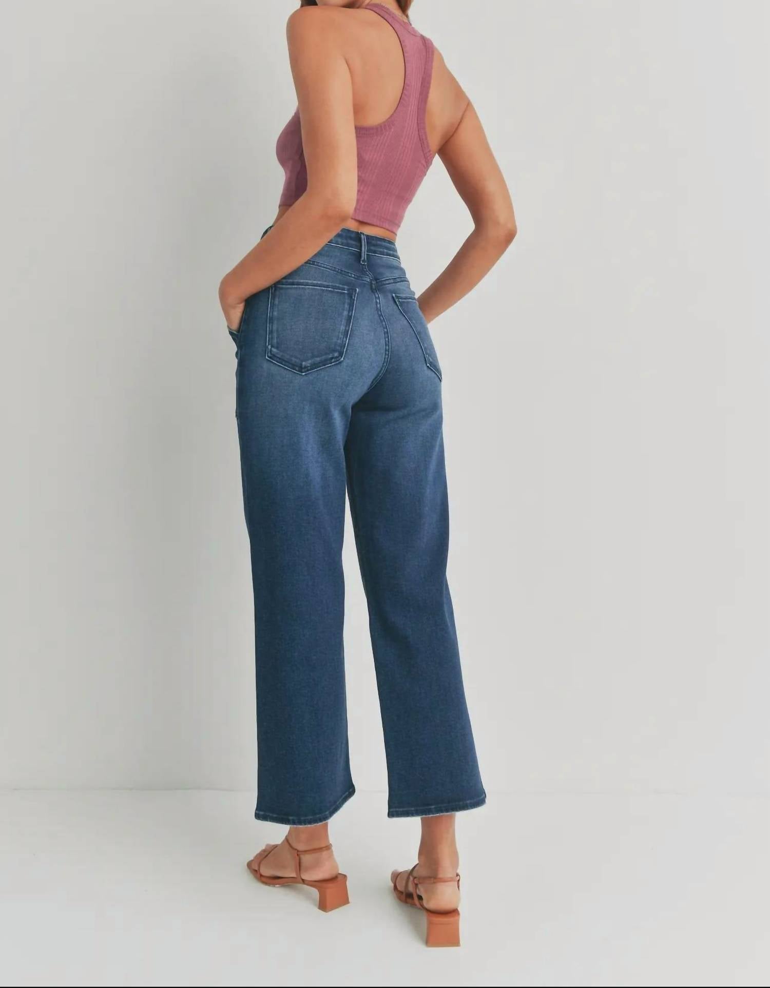 A flattering silhouette that's suprisingly versatile. Perfect for a streetwear-inspired fall look. Relaxed fit have a flattering high rise of 12 inches and a medium wash solid blue color. Crafted from a cotton blend composed of 93% cotton, 5% polyester, and 2% spandex. Boast a zip closure and wide leg style with a 27-inch inseam. Convenient cargo pockets add functionality. Care is simple with machine wash and tumble dry instructions.
