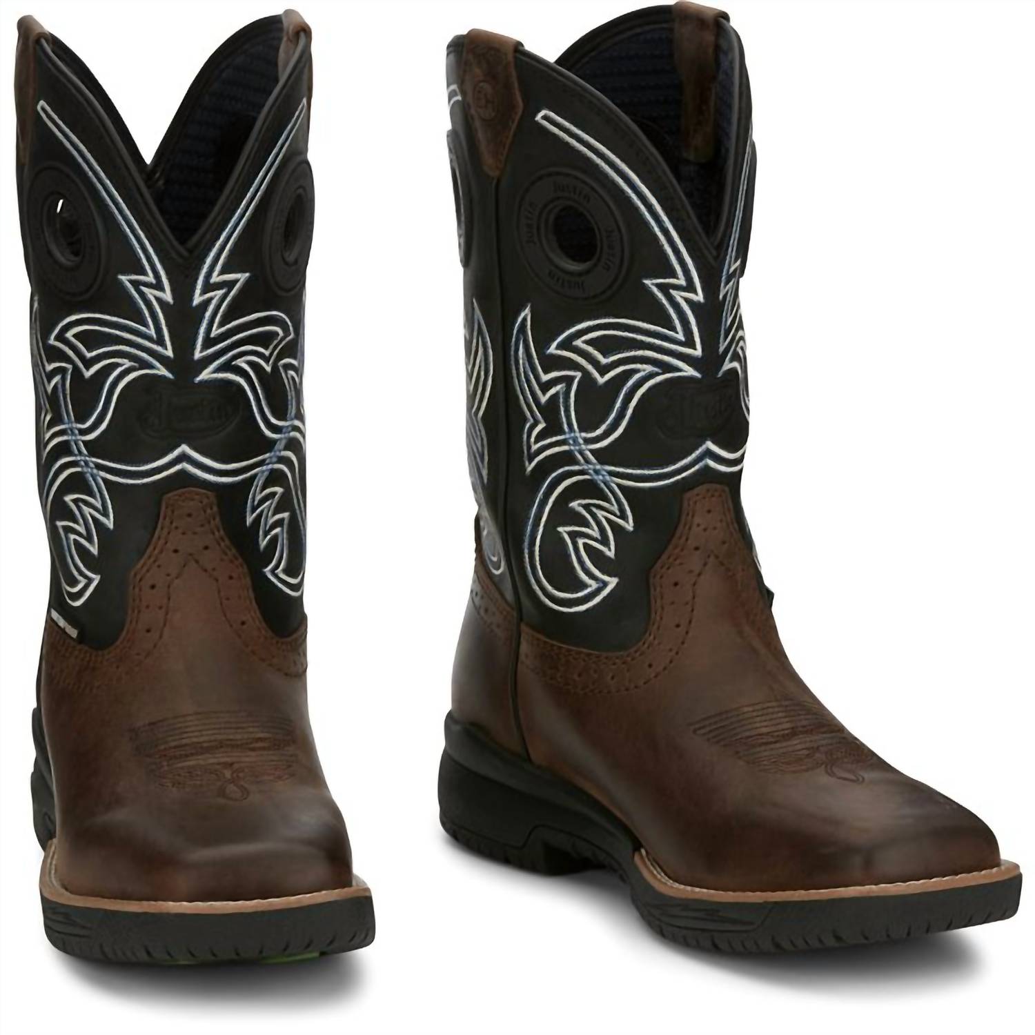 Introducing the NiTread Waterproof Toffee Boot by Justin Boots, crafted with premium full-grain leather for enduring style and resilience. These boots feature a squared toe and chunky low heel, making them an ideal choice for comfort and stability. With a high-tech design, the oil and slip-resisting rubber outsole ensures safe traction, while the N2Gen™ technology deadens shock and reduces foot fatigue. Perfect for long wear, these boots meet ASTM F2892 safety footwear standards, ensuring reliability on any terrain.