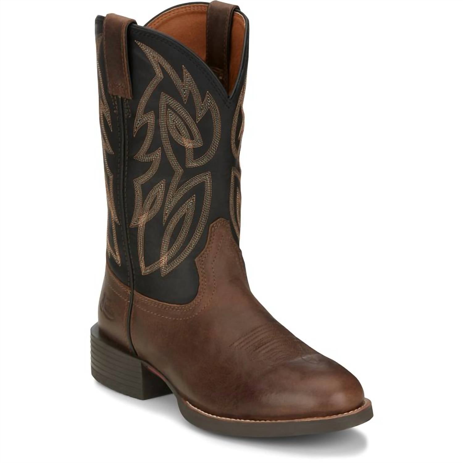Step up your style with the Rendon Pecan Wide Round Boot from Justin Boots' Stampede Collection, crafted for comfort and durability. Made from premium cowhide leather, this boot features a wide round toe and a cowboy spur ridge heel for a classic western look. An oil-and slip-resistant non-leather rubber outsole ensures stability, whether you're in the saddle or on the street. Perfect for the outdoors, these boots come in a sophisticated brown and black colorway.