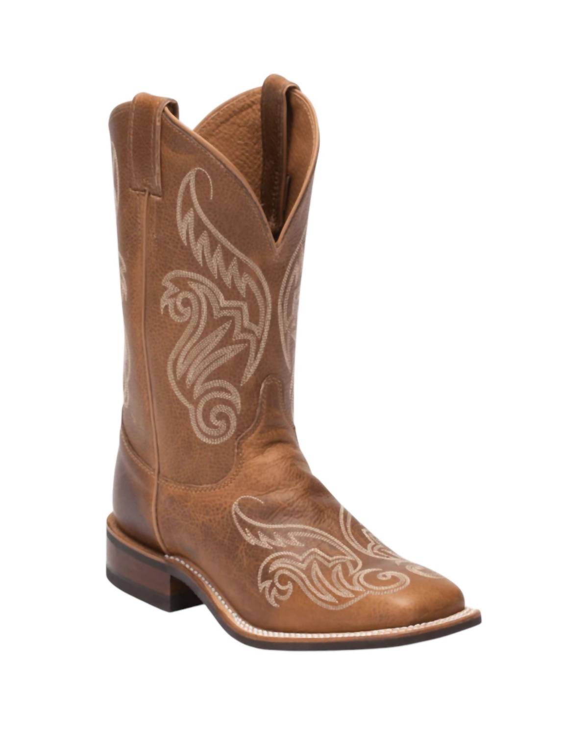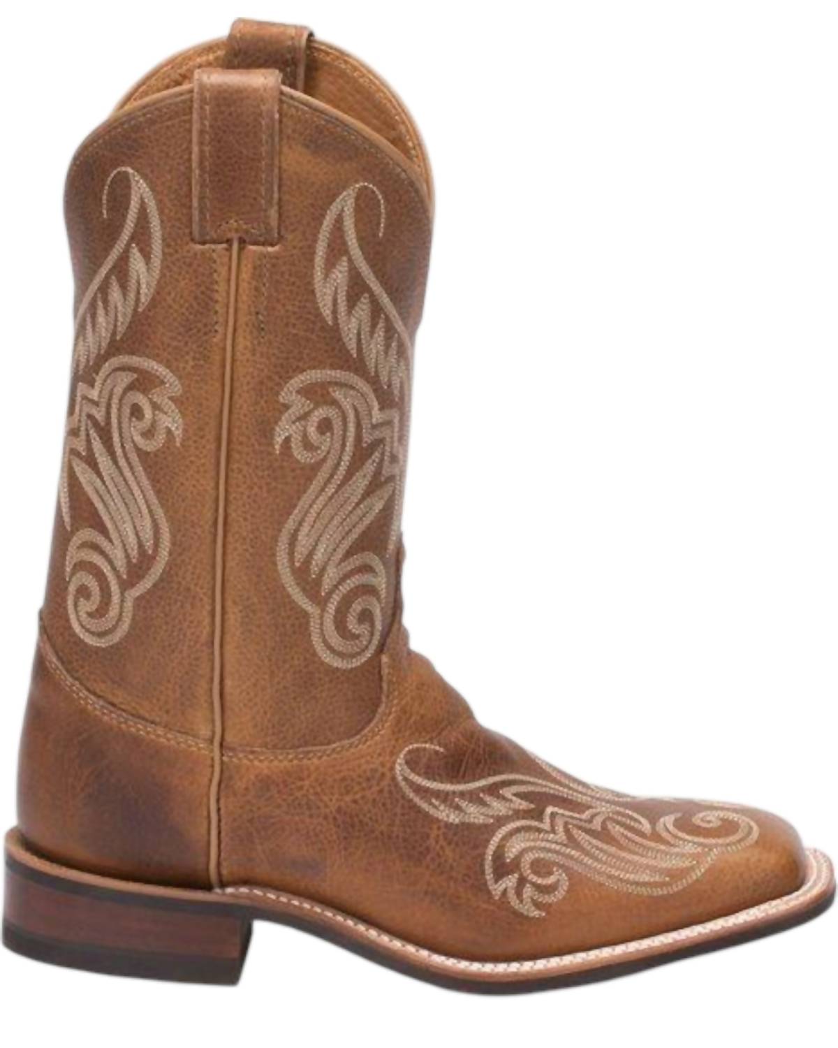 Distressed brown leather boot with bold stitching. Material: 100% cowhide leather. Care: Brush off dirt every 3-5 wears and apply conditioning cream as needed.