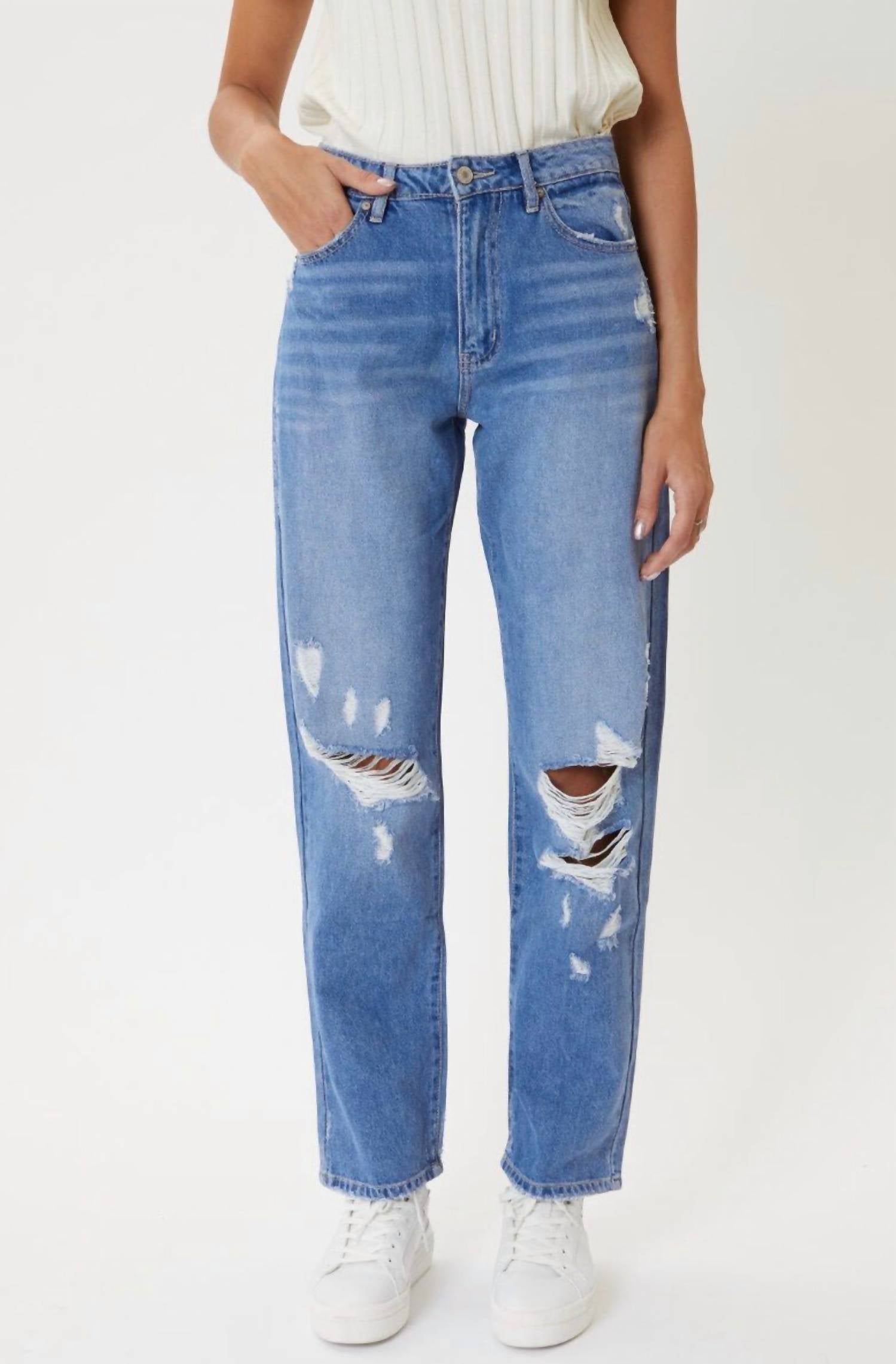 These boyfriend jeans make anything you pair them with look effortlessly cool. Introducing the 90’s Boyfriend Jeans by KanCan, a throwback essential with a modern twist in a medium wash. These high-rise jeans feature a comfortable zip closure and a classic straight leg style with a distressed finish and a straight cuff. Crafted from a soft cotton blend of 55% Cotton and 45% Rayon, they come with a generous 11" rise and a 30" inseam in size 5, though they run small. Care is simple with machine wash instructions.