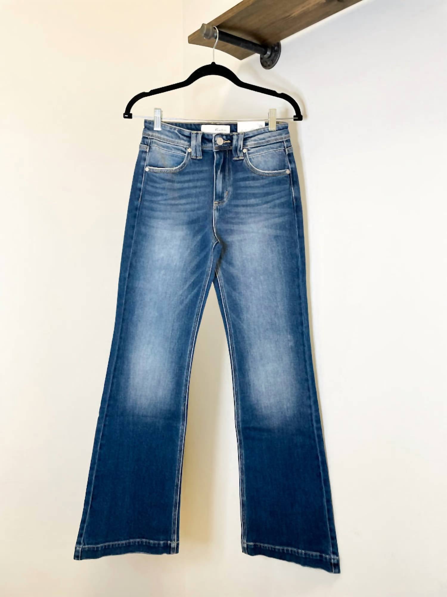 Just add boots! Experience comfort and style in a chic medium stone wash. Crafted from 99% cotton and 1% spandex. High-rise jeans feature a relaxed fit and a flattering bootcut leg designed to elongate your silhouette. Button closure. Machine wash and tumble dry. With an 11" rise and a 34" inseam. Offer a perfect blend of trendy detailing with functional pockets.