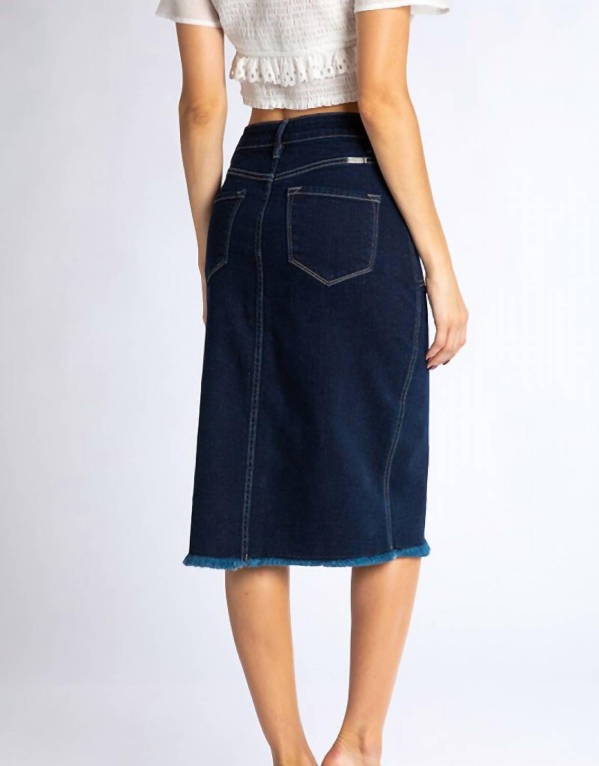 Tuck your favorite tee into this midi length skirt for an effortlessly cool look. The KanCan Button Down Midi Skirt is a chic addition to your wardrobe, crafted in a solid blue cotton blend with a touch of spandex for added comfort. It features a stylish button closure and practical pockets, with the front length measuring 26 inches and the back 27 inches for a flattering drape. Ideal for a casual or semi-formal look, this skirt is a must-have for any fashion-forward woman seeking versatility in her midi options.