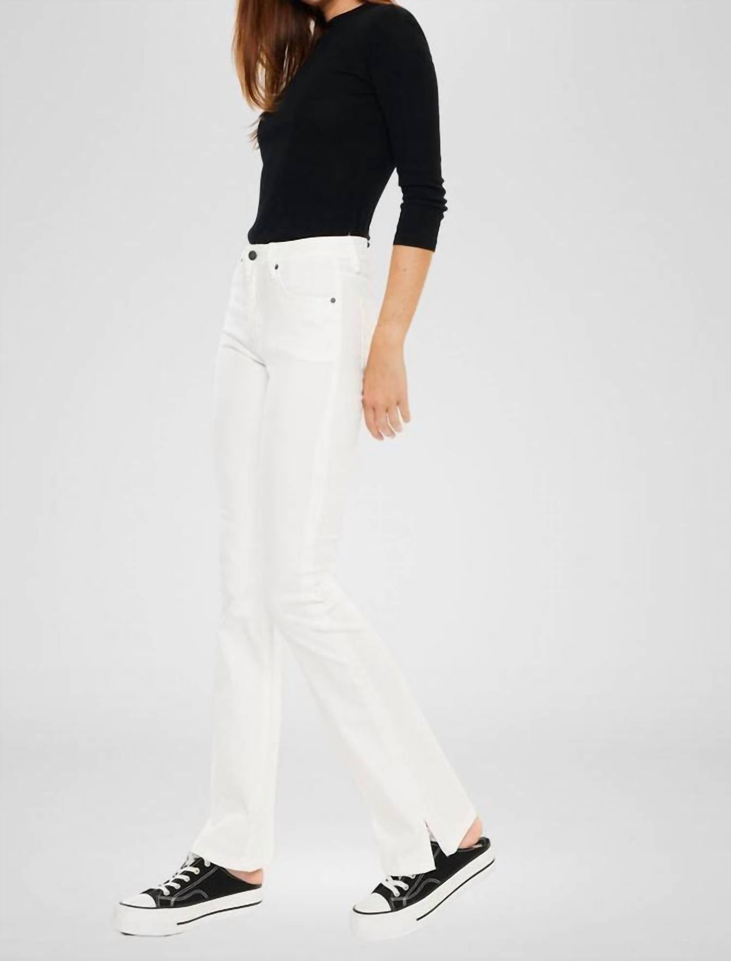 Discover the KanCan High Rise Boot Cut Jean in white, a perfect blend of style and comfort. These jeans feature a high rise with a 10" rise and a 32.5" inseam, providing a flattering fit that tapers at the thigh and flares at the calf. Crafted from a cotton blend of 98% Cotton and 2% Spandex, they offer stretch for all-day comfort while maintaining their shape. Designed with a classic five-pocket style and finished with a button closure and zip-fly, these jeans are a chic addition to your preppy, back-to-school wardrobe. Model is wearing size 25.