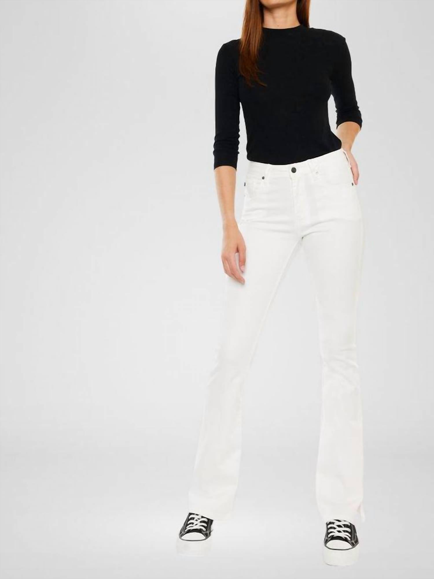 Just add boots! Discover the KanCan High Rise Boot Cut Jean in white, a perfect blend of style and comfort. These jeans feature a high rise with a 10" rise and a 32.5" inseam, providing a flattering fit that tapers at the thigh and flares at the calf. Crafted from a cotton blend of 98% Cotton and 2% Spandex, they offer stretch for all-day comfort while maintaining their shape. Designed with a classic five-pocket style and finished with a button closure and zip-fly, these jeans are a chic addition to your preppy, back-to-school wardrobe. Model is wearing size 25.