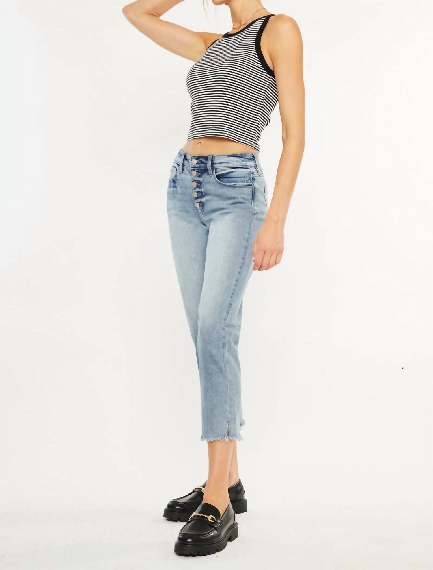 These must-have jeans are fit to perfection. These high-rise straight-fit jeans offer a stylish blend of classic and modern details, featuring subtle fading, slight contrast at the waistband, and a frayed hem for an on-trend touch. Designed to sit just above the waist, they provide a relaxed fit through the leg and hit at the ankle—perfect for everyday wear.