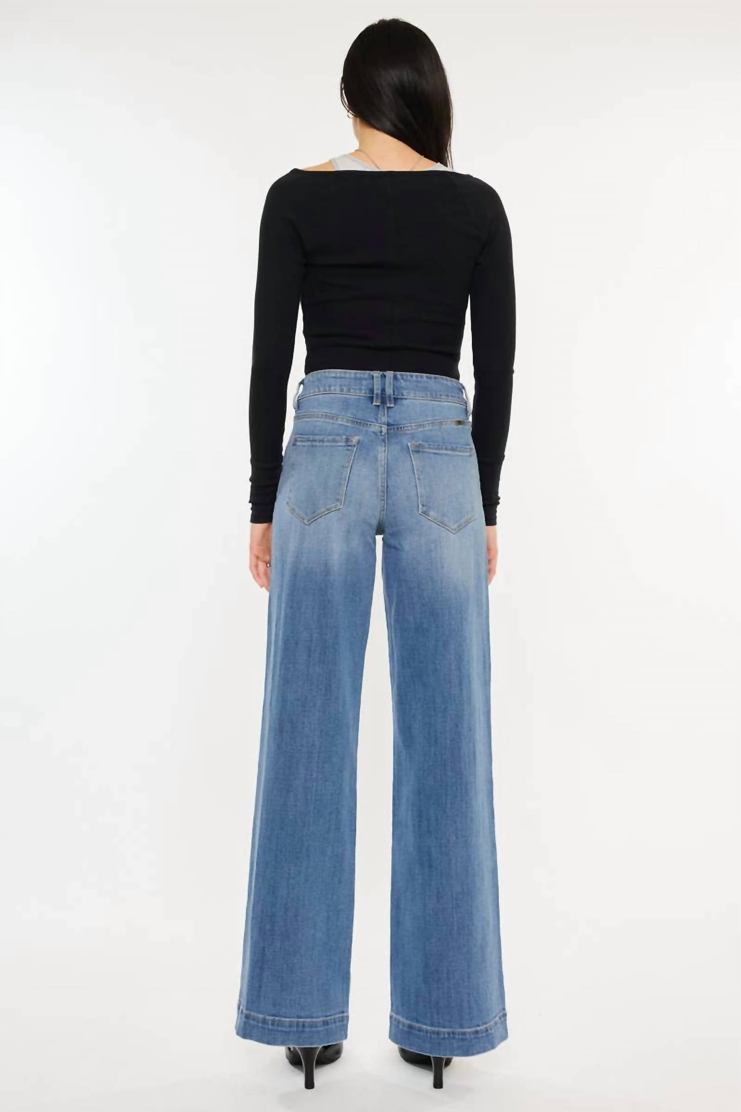 A flattering silhouette that's suprisingly versatile. These trouser jeans feature a wide-leg design, zip fly, and pockets. Made from 99% cotton and 1% spandex, with an 11" rise and a 32" inseam.