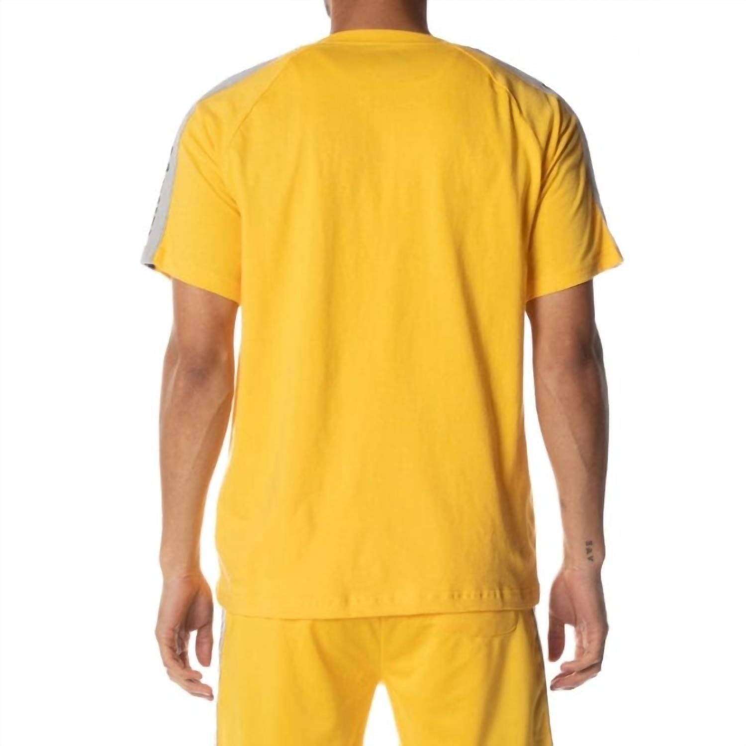 Introducing the Kappa Logo Tape Davirec Tee Shirt, designed for men with a streetwear-inspired style. This activewear t-shirt features short sleeves and a classic crewneck, crafted from 100% cotton for ultimate comfort. Highlighting the brand's identity, the tee includes logo tape on the sleeves and the iconic Omini logo printed on the chest. With a pull-on closure, it's an ideal choice for summer vacations with a striking yellow, grey, and black colorway.