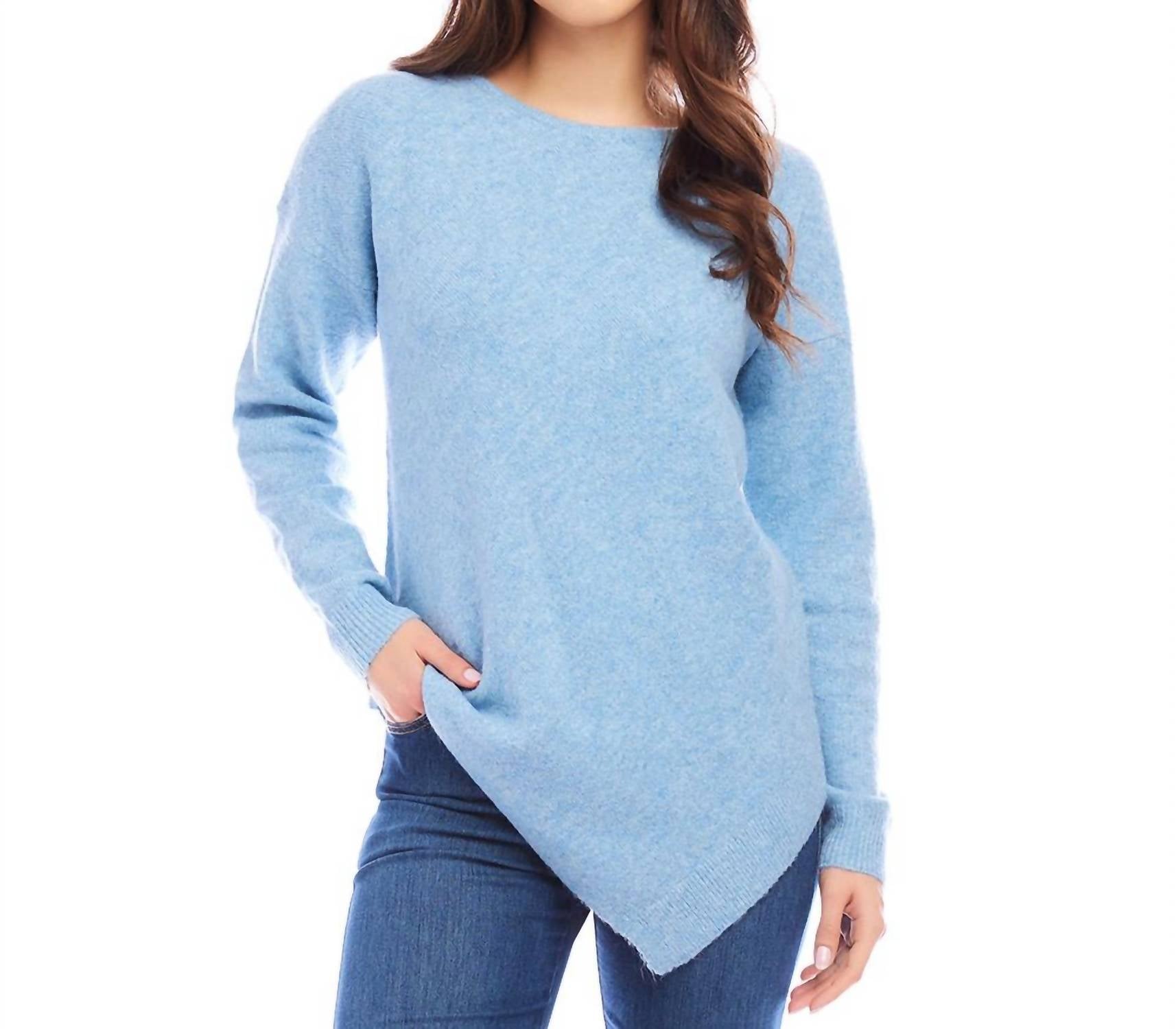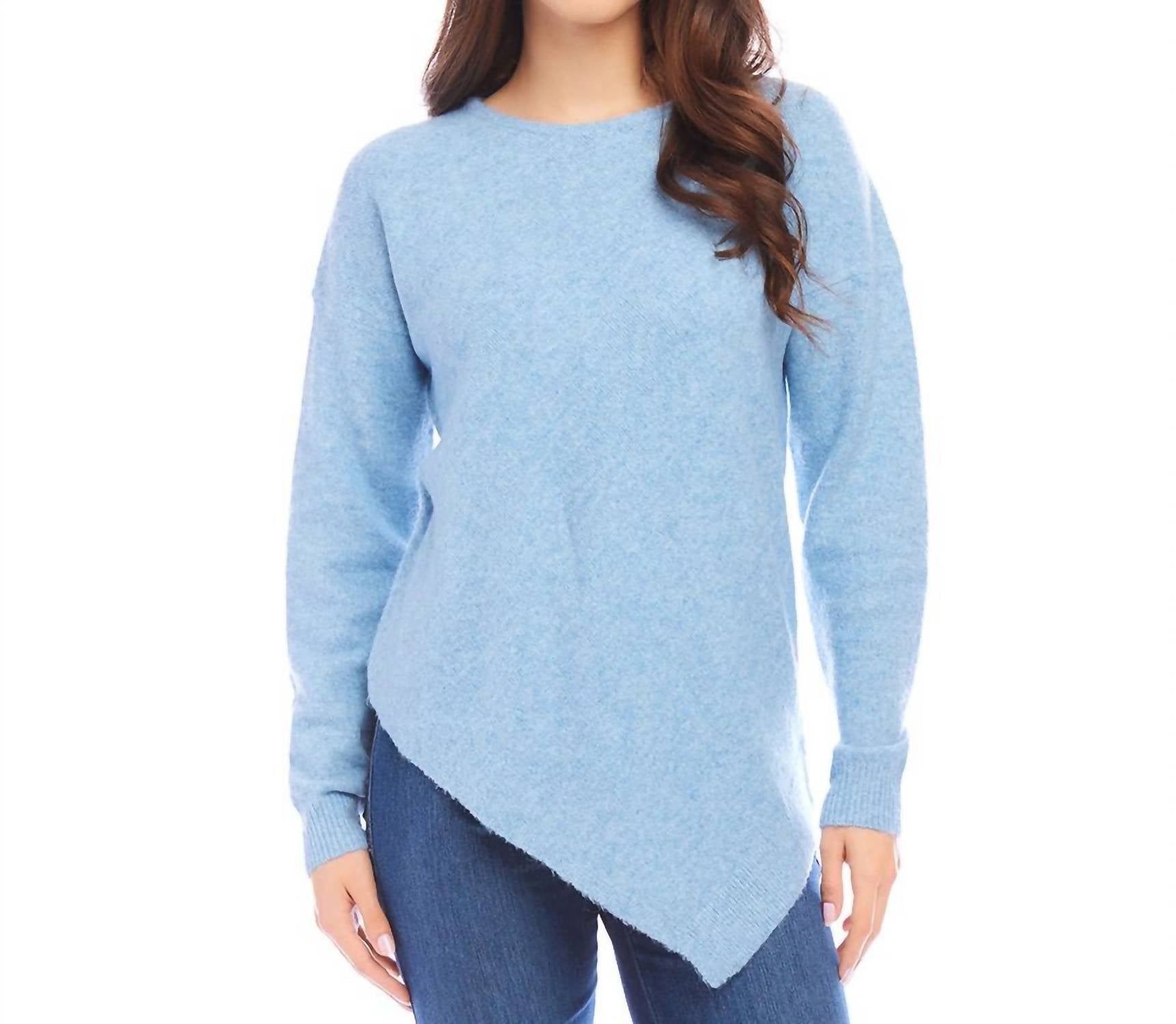 Elevate your wardrobe with the Asymmetric Hem Sweater by Karen Kane in a serene Sky Blue, designed for women who seek both style and comfort. Featuring long sleeves and crafted from a blend that includes 33% recycled polyester, this 30.5-inch cardigan exudes a relaxed silhouette with a boat neckline and ribbed hem detail. Imported and designed for travel, this solid pattern sweater closes with a pull-on style. For best care, dry clean only.