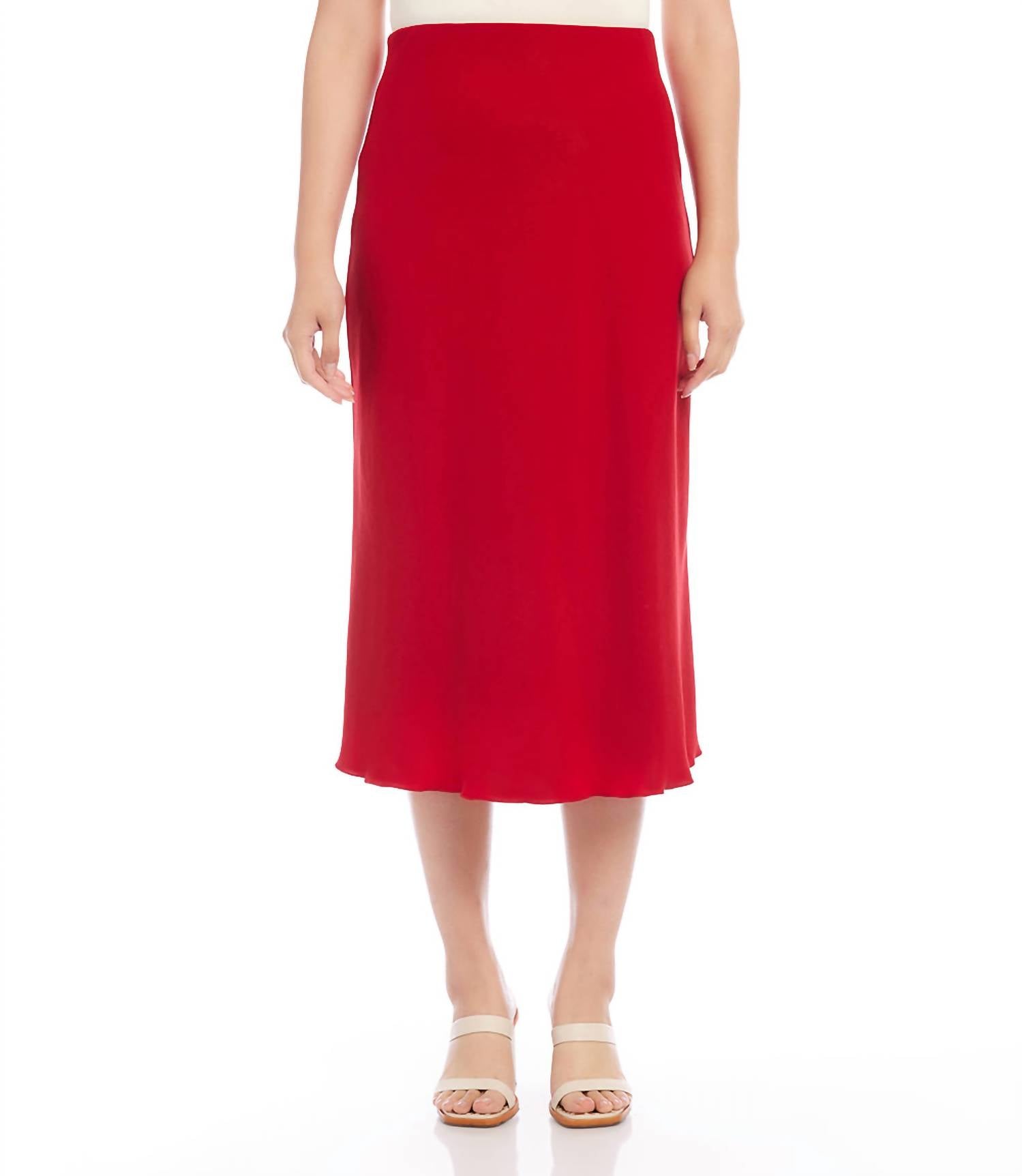 Tuck your favorite tee into this midi length skirt for an effortlessly cool look. Elevate your evening ensemble with the Satin Bias Cut Midi Skirt by Karen Kane, a perfect addition for sophisticated outings. Featuring a luxurious heavy satin finish in vibrant red, this skirt offers a timeless appeal with its bias cut design that drapes seamlessly. Composition: 100% Polyester. Length: 30 3/4 inches (size M). Made in the USA of imported fabric. Closure: Slip-on with an elasticized waist. Care: For best results, dry clean or hand wash cold.