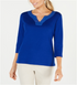 Karen Scott's casual cotton top couldn't be simpler or more charming with crocheted trim outlining its flattering split V-neckline. | Easy fit; hits at hip; approx. 27 long| Due to generous sizing| we suggest sizing down for the perfect fit| Split V-neckline with crochet trim| 3/4-sleeves|