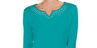 Karen Scott Women's Cotton Studded Split-Neck Top Blue Size Medium