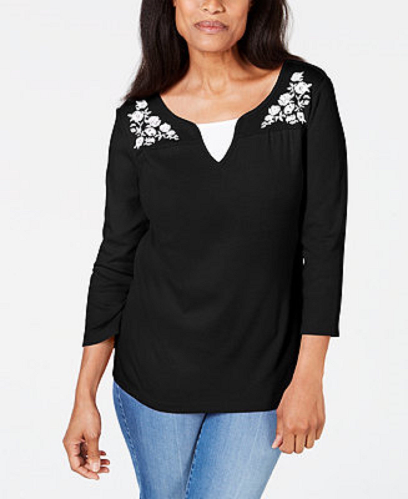 Karen Scott Women's Embroidered Cotton Layered-Look Top Black Size Small