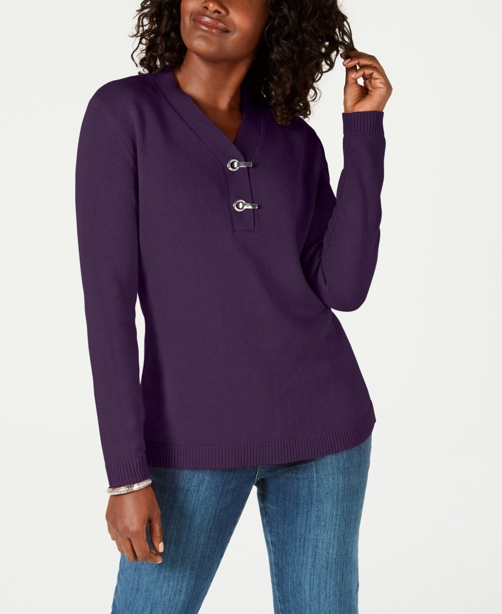 Karen Scott Women's Hardware V Neck Cotton Sweater Purple Size X-Small