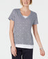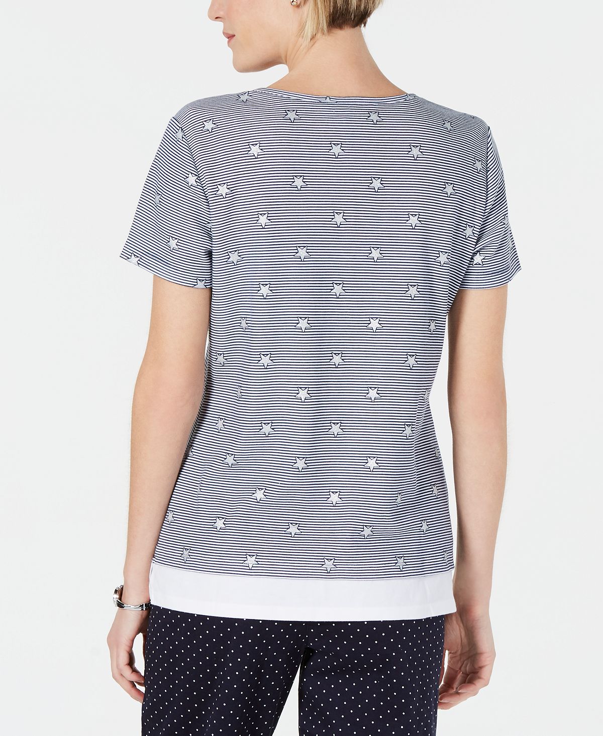 A festive mix of glittery stars on micro-striped knit tops solid-color accents for a put-together layered look from Karen Scott.| Hits at hip| Due to generous sizing| we suggest sizing down for the perfect fit| V-neck on outer layer; scoop neck on inset| Layered look at neckline and hemline |