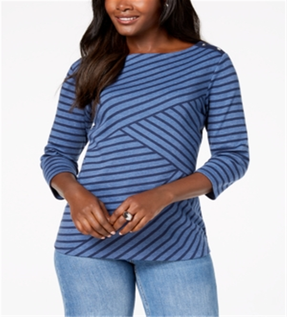 A mix of stripes decorates this casual Karen Scott top| a relaxed pick styled with 3/4-sleeves and a sweeping boat neckline