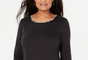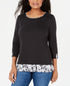 Karen Scott Women's Patterned 3/4 Sleeve Jewel Neck Top Black Size Small