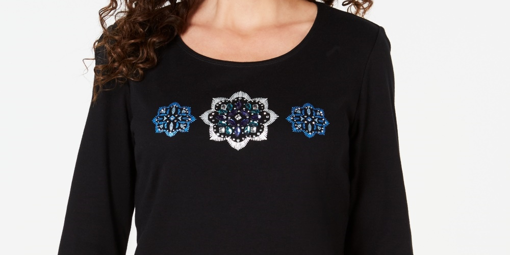 Relaxed fit; hits at hip; approx. 24-1/2|Designed to fit and flatter 5'4 and under frame|Scoop neckline|Rhinestone embellishments at front|3/4-sleeves