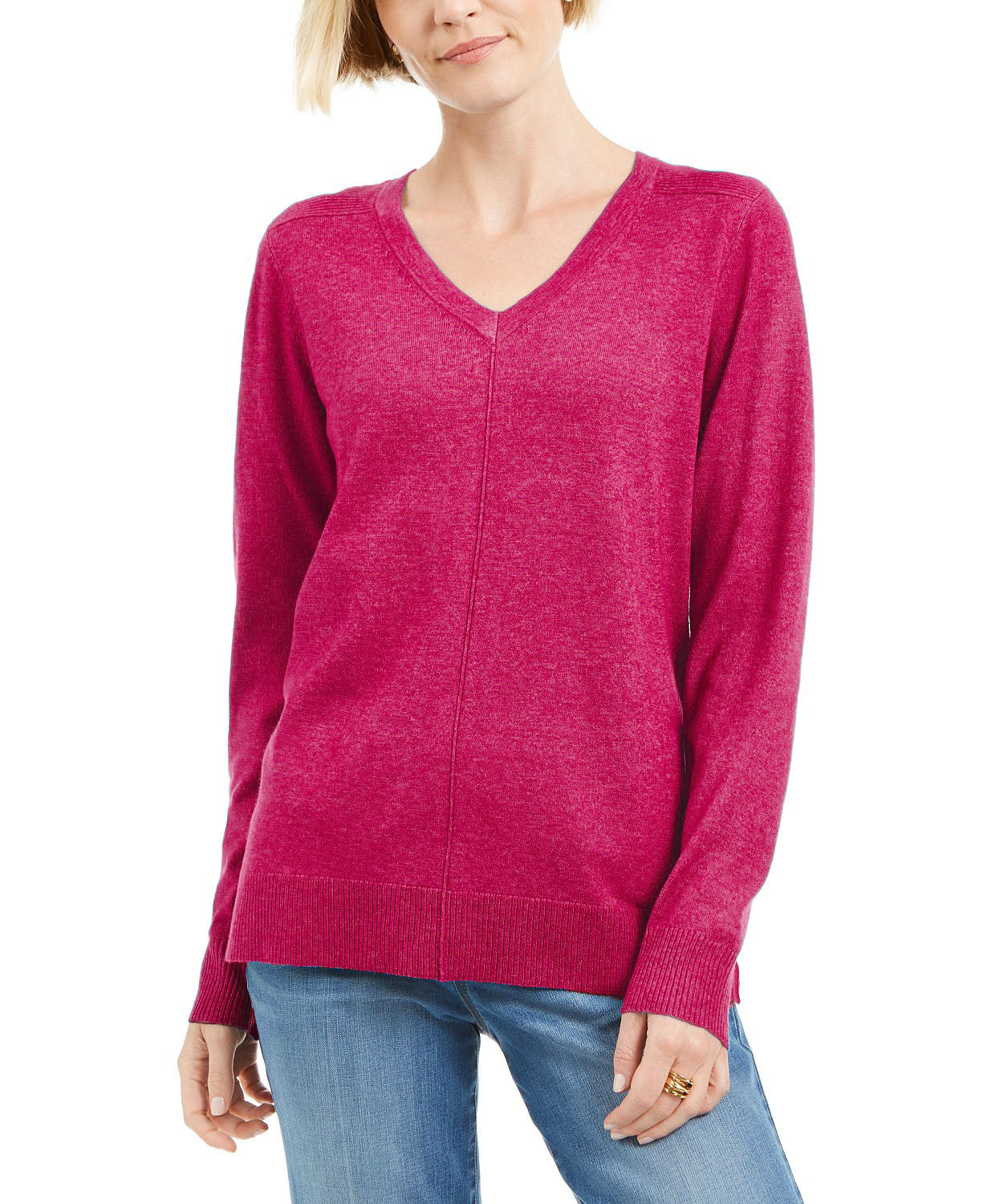 Approx. model height is 5'10" and she is wearing a size medium|Relaxed fit; hits at hip: approx. 26-1/2" long|Due to generous sizing, we suggest sizing down for the perfect fit|V-neck|Seam detail at center front and center back; ribbed hemline band with side slits|Long sleeves with ribbed cuffs