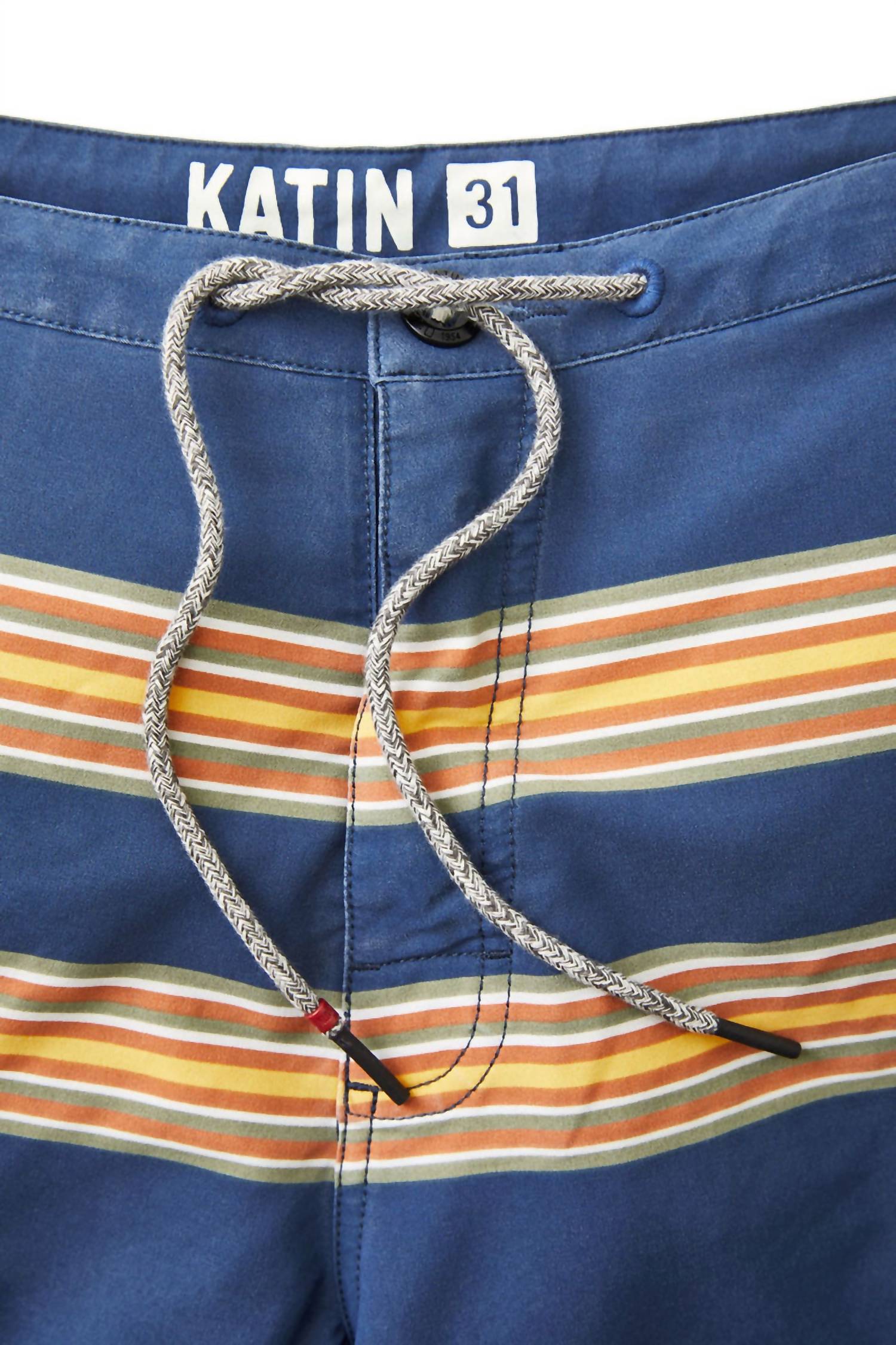 Introducing the Men's Hoffman Trunk by Katin, a timeless board short that fuses classic design with modern performance. Made from 90% Repreve and 10% Spandex, these navy striped trunks offer a 4-way stretch for unmatched comfort and mobility. With an 18" outseam and a 1.5" lace-up waistband, it features a hidden snap fly and reinforced stress points, ensuring a secure fit. Perfect for a beach day, these stylish swim bottoms combine durability with iconic 90s fashion flair.