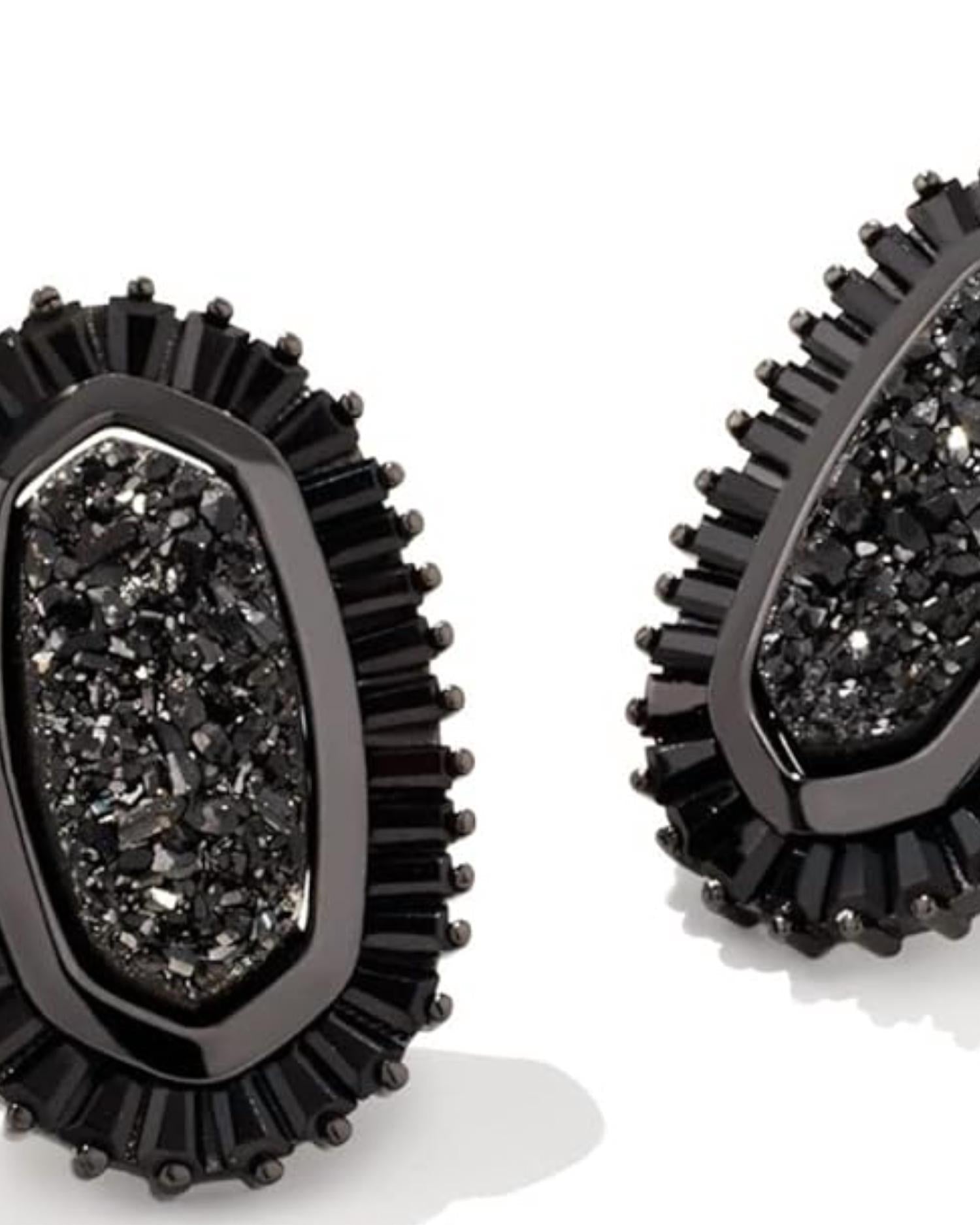 Easy and elegant earrings to complement any outfit. Elevate your ensemble with the Baguette Ellie Stud Earrings by Kendra Scott, blending simplicity with sophistication in gunmetal and black drusy. Crafted from brass, these earrings feature crystal-framed silhouettes that catch the light beautifully due to the natural crystallization of genuine drusy. The iridescent finish is achieved through a unique plating process for a sparkling gleam. Measuring 0.79" in length and 0.53" in width, they are designed to add a touch of high shine to any look.