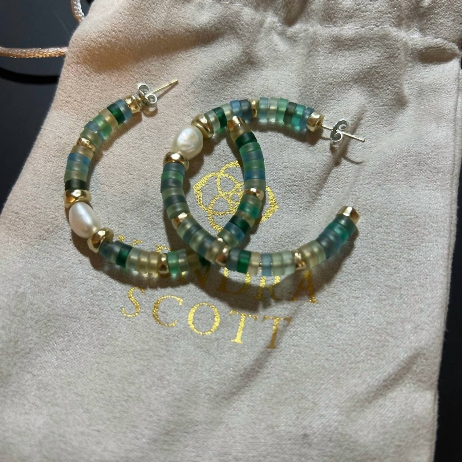 Classic earrings that will take you from season to season. Dive into a tropical escape with the Women's Lila Hoop Earrings by Kendra Scott, a striking blend of sea green mix and beachy influences. Crafted with 14k gold-plated brass and adorned with China glass beads and naturally shimmering white pearls, these earrings capture the essence of effortless elegance. Measuring 1.8" in outer diameter, they are perfect for adding a touch of sophistication to both everyday neutrals and vibrant summer outfits. Ideal for those who appreciate fine jewelry with an organic twist.