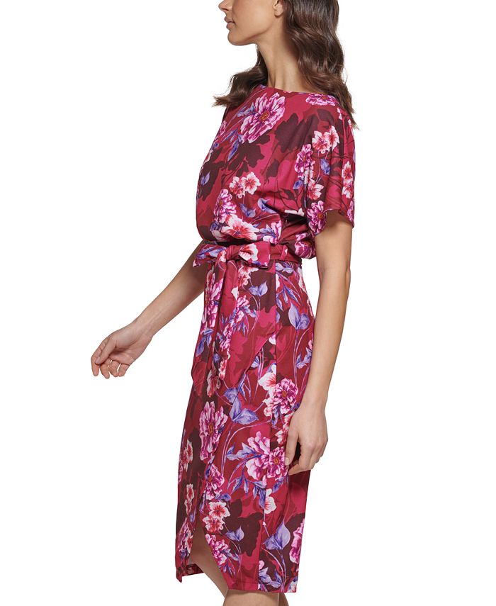 Bright florals pop against the ivory backdrop of this kensie dress| a party-ready sheath with the perfect fit.| Printed; tie at waist| Imported| Hidden back zipper closure| Crewneck; Sheath silhouette|