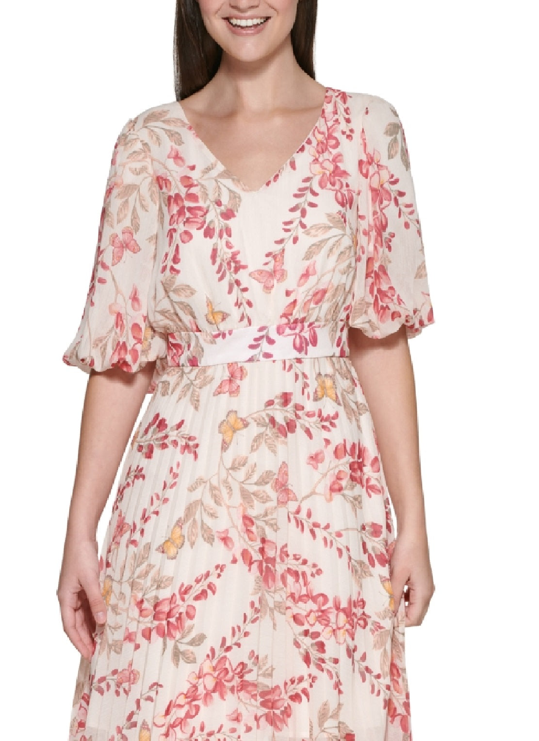 Light and lovely floral-print chiffon shapes up softly and structured in the billowy sleeves and knife-pleated skirt of kensie's fun-friendly maxi dress. | Approx. 56-1/4 long from center back neck to hem. Length is based on size 4 and varies 1/2 between sizes| Runs true to size; order your normal size| Ankle-length or longer casual dress| Chiffon; Smooth| sheer woven fabric| V-neck; Maxi dress silhouette