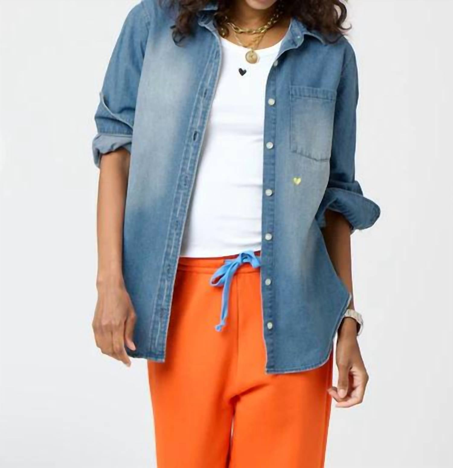 Introducing the Mia Shirt by Kerri Rosenthal, a timeless piece in True Denim featuring long sleeves and a textured pattern. Crafted from lightweight cotton, this versatile shirt can double as a shacket, enhanced by the charming tiny embroidered heart detail. Button closure. Machine wash and tumble dry for easy maintenance. 100% washed cotton denim.