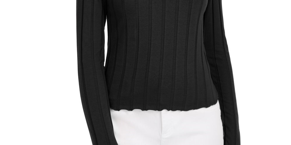 Fitted|Mock-neck|Lettuce edges; wide ribbed texture|Cotton/polyester|Machine washable