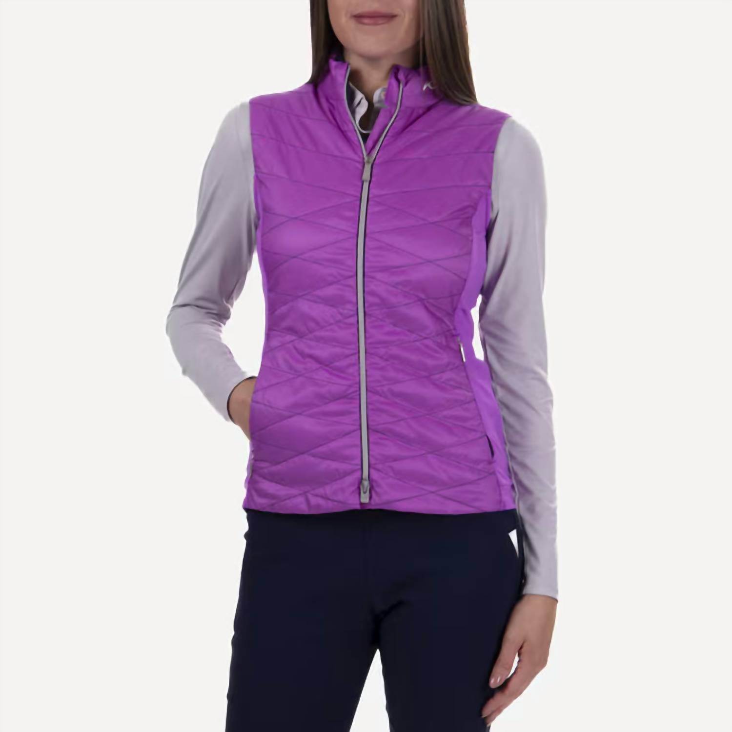 Elevate your spring athleisure wardrobe with the Women's Insulated Retention Vest by KJUS in Foxglove. This sleeveless vest, crafted from 89% Polyester and 11% Elastane, features a regular fit with a refined quilted front and a luxuriously soft knit back for ultimate comfort and movement. Designed with a college collar and a sleek 2-way Metaluxe YKK zip closure, it includes concealed front pockets with zippers for added convenience. Easy to care for, just machine wash and tumble dry, making it perfect for fitness activities, the golf course, or everyday wear.