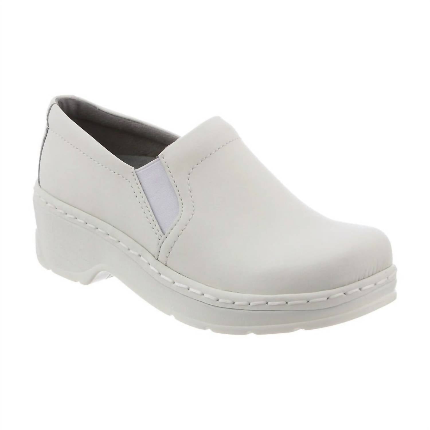 Introducing the Women's Naples Slip Resistant Work Clogs by Klogs Footwear, expertly crafted for demanding days on your feet. These clogs feature smooth leather uppers with dual-elastic side goring, ensuring a comfortable fit with every step. Proudly made in the USA, they boast a round toe shape and closed back for additional support. The TRUComfort® Insoles and TRUBase® Outsoles with PURGrip® treads offer slip and oil resistance, while the non-marking design and low heel height of 1 3/4 inches provide stability and durability.