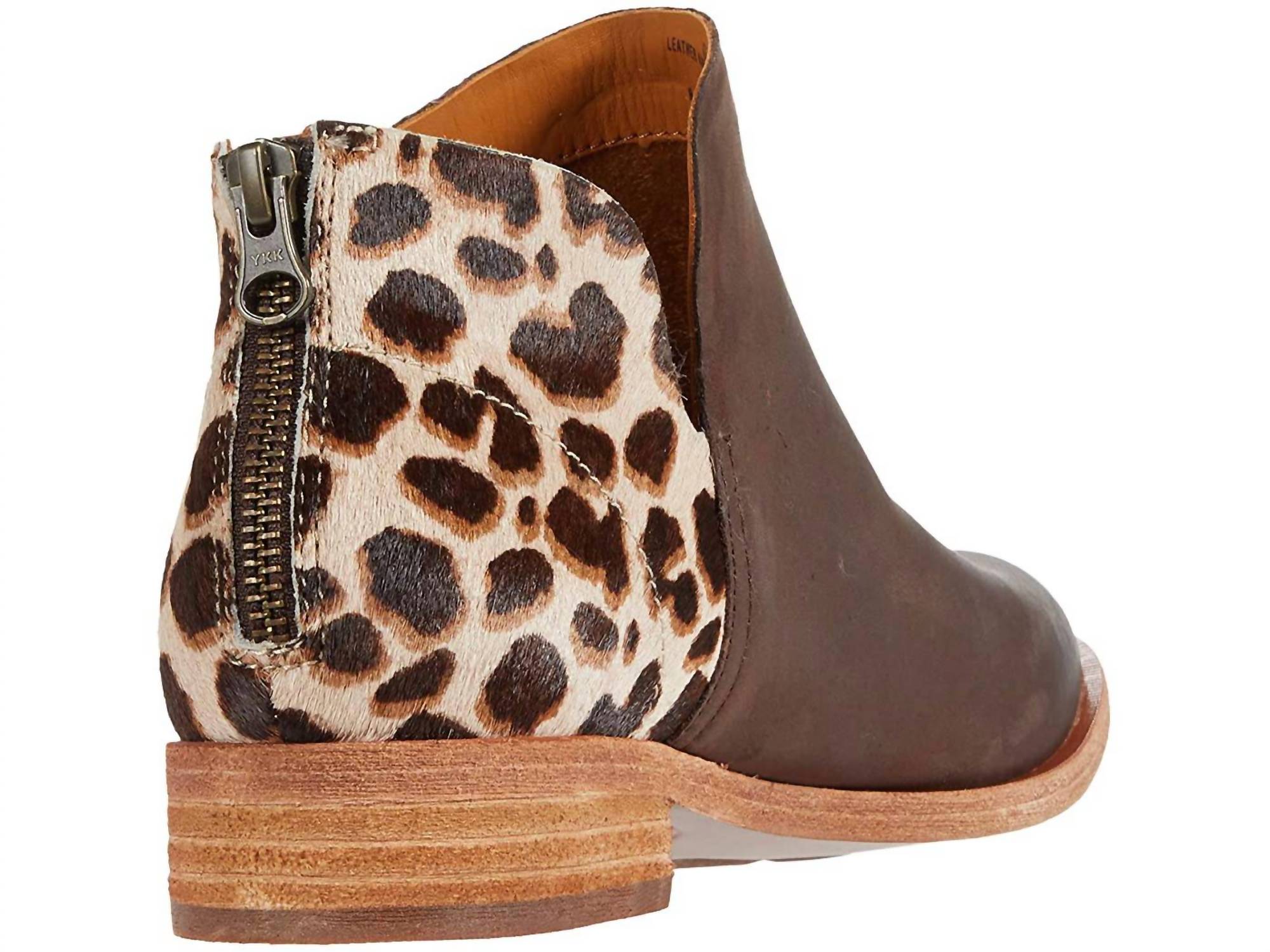 Introducing the Women's Renny Leopard Booties by KORK-EASE, a stunning addition to your fall wardrobe with a dark brown hue that embraces the Y2K trend. Crafted from full-grain leather, suede, or a full-grain leather and haircalf combination, these shoeties feature thoughtfully placed side cut-outs for a unique flair. They come with a leather lining, cushioned leather footbed, and a sturdy leather and rubber outsole for ultimate comfort. The back zipper allows for easy on-and-off, and the block heel with a round toe shape is perfect for travel.