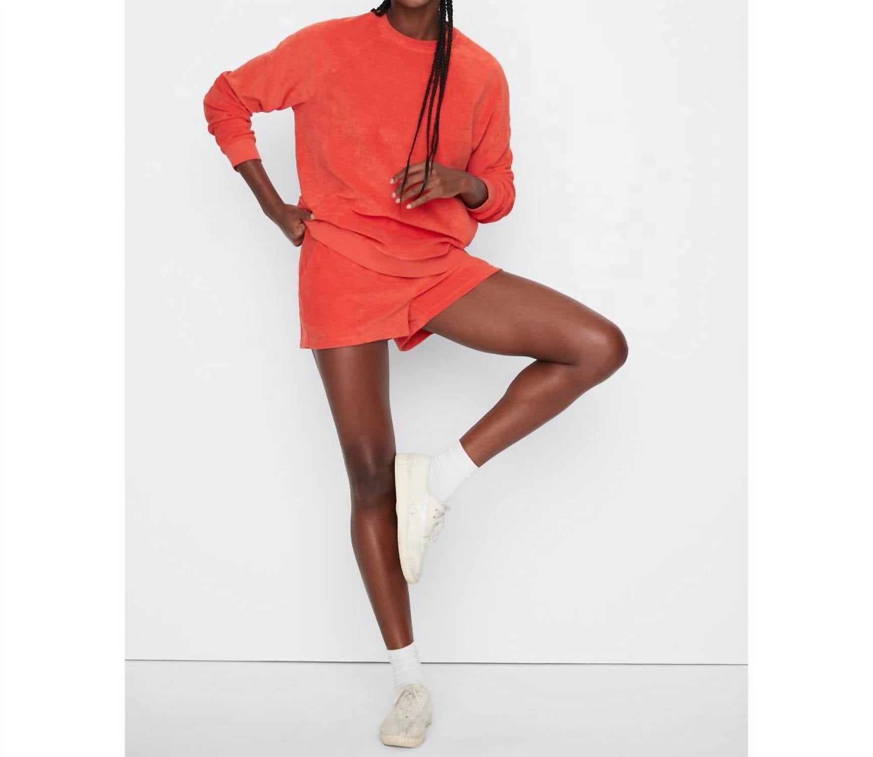 Introducing the KULE Terry Venus Short in Poppy, perfect for the summer season. These easy pull-on high-waist shorts feature a plush terry knit texture and handy pockets for convenience. Crafted from a comfortable 83% Cotton and 17% Polyester blend, they are machine washable and proudly made in Portugal. Ideal for travel, these solid pattern shorts capture the Y2K trend, making them a stylish choice for any Easter getaway.