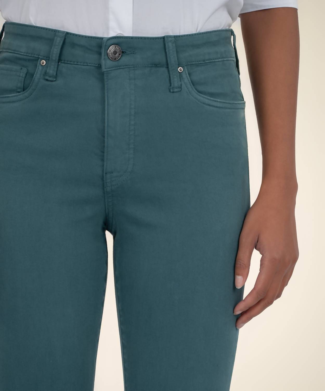 Elevate your denim collection with the Kelsey High Rise Gab Ab Jeans by KUT FROM THE KLOTH in striking teal. These jeans feature a high-rise design and a classic fit that flares at the ankle with an inseam of 27.75 inches, creating a trendy silhouette with a 10.25-inch rise and 17.75-inch leg opening. Made from 98% cotton and 2% spandex, they offer a soft, low-stretch fabric for comfort and fab ab front pockets that ensure a smooth look. Closure: Button closure. Care Instructions: Machine wash and lay flat to dry.