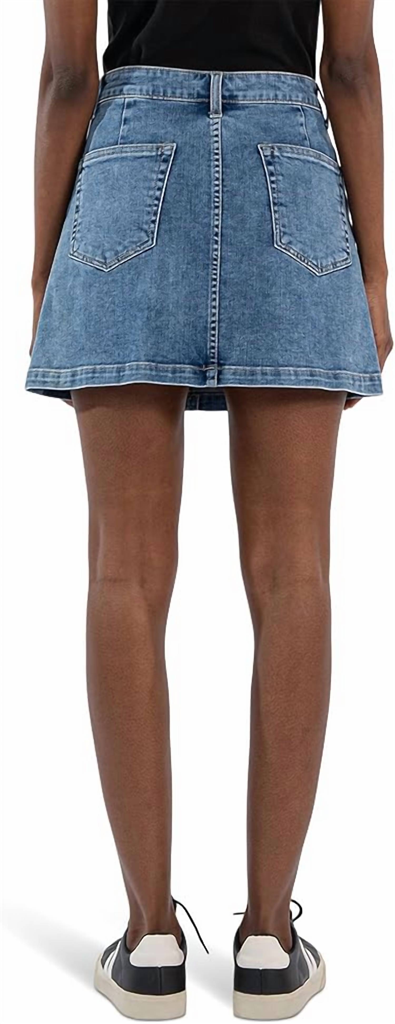 Tuck in your favorite tee for a more laid-back vibe. Elevate your style with the Zoe Skirt by KUT FROM THE KLOTH, perfect for any casual outing. This mini-length denim skirt comes in a striking "Alarming" color, crafted from a comfortable cotton blend—93% cotton, 6% polyester, and 1% spandex—that offers flexibility and superior comfort. The mid-rise design features a zip-fly with buttoned closure, complemented by belt loops and convenient two side seam pockets plus two back pockets for practicality. Easy to care for, this skirt is machine washable and designed to add a fashionable twist to your wardrobe. Imported.