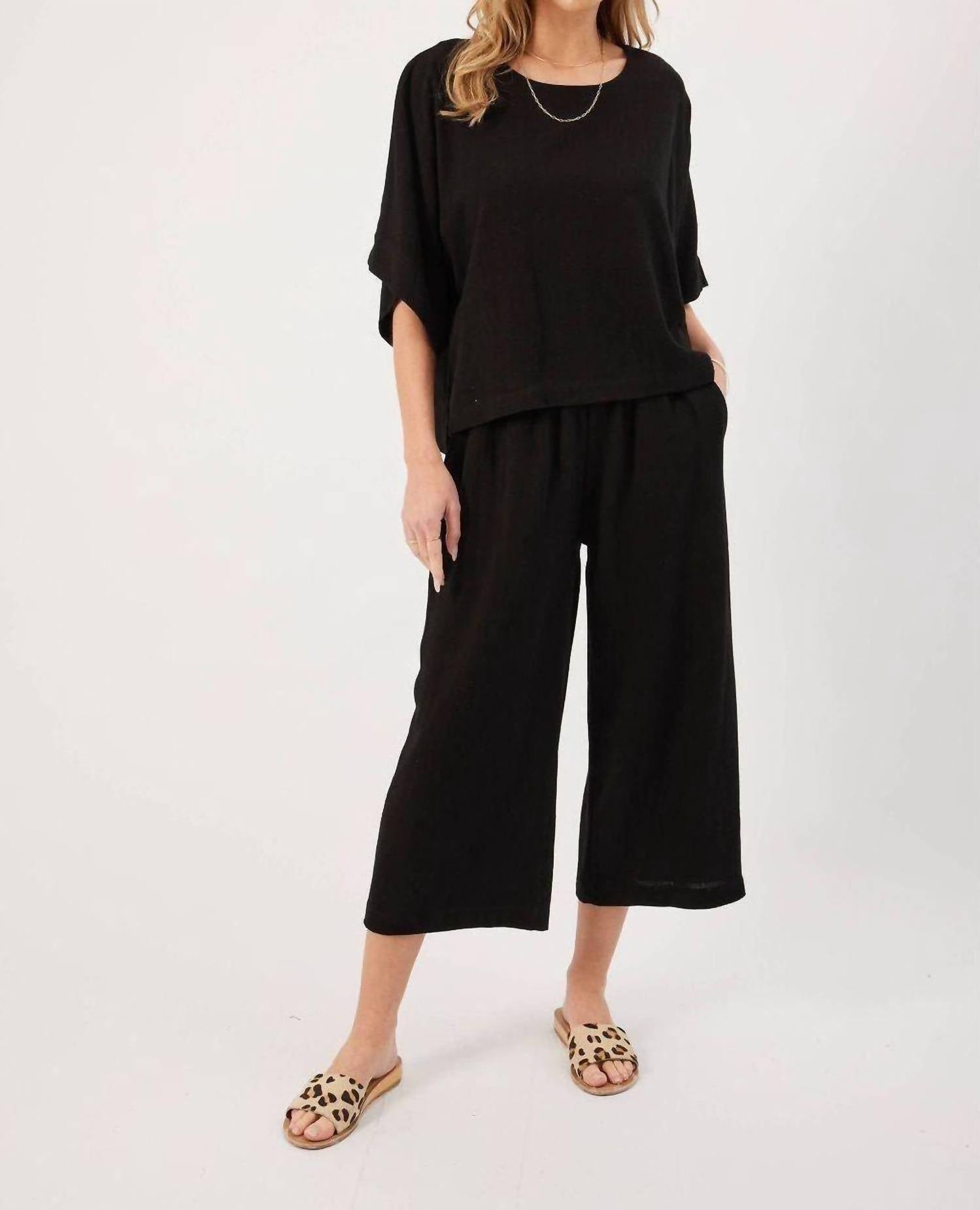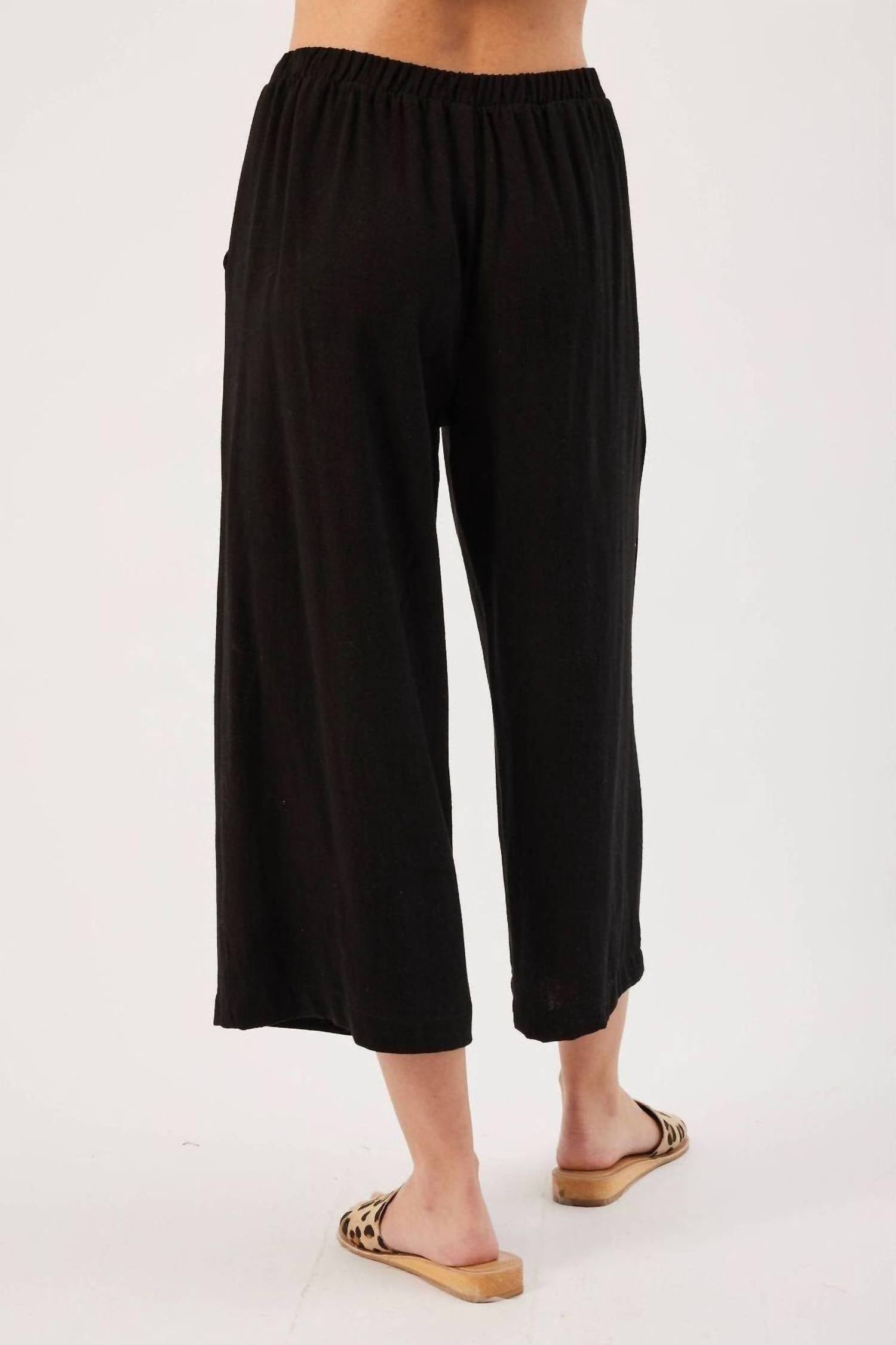 Elevate your casual wardrobe with the Justyne Relaxed Pull On Pant by Kylie Paige in classic black. These wide-leg, high-rise pants offer a relaxed fit, complete with a convenient pull-on closure for easy wear. Crafted from 75% Rayon and 25% Linen, these pants are designed to keep you cool and stylish during any laid-back day. Length: 32", Inseam: 22". Model is 5'9" and wearing a size Small.