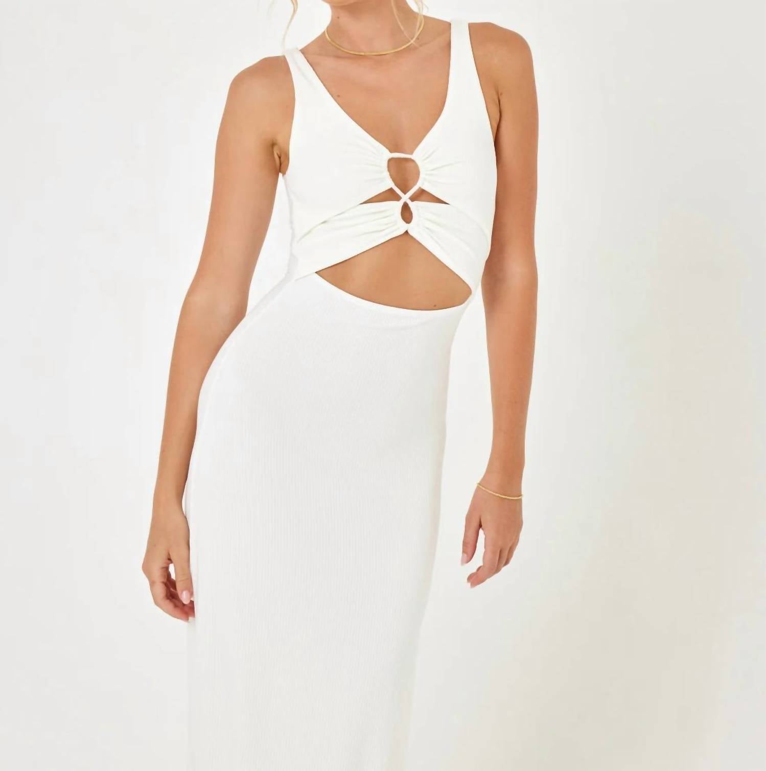 Just add slides or mules and you are good to go. Elevate your wardrobe with the Camille Dress by L*SPACE, a striking piece perfect for any occasion. This sleeveless, solid ivory dress features thick straps and a stylish scoop neckline, complemented by loop cutout details at the waist and a side slit for added flair. Crafted from a soft and stretchy viscose blend composed of 92% Viscose and 8% Elastane, it offers a comfortable fitted silhouette that ends at the ankle. Care is essential: hand wash in cold water and lay flat to dry to maintain its vibrant shape and color. Closure: Pull on.