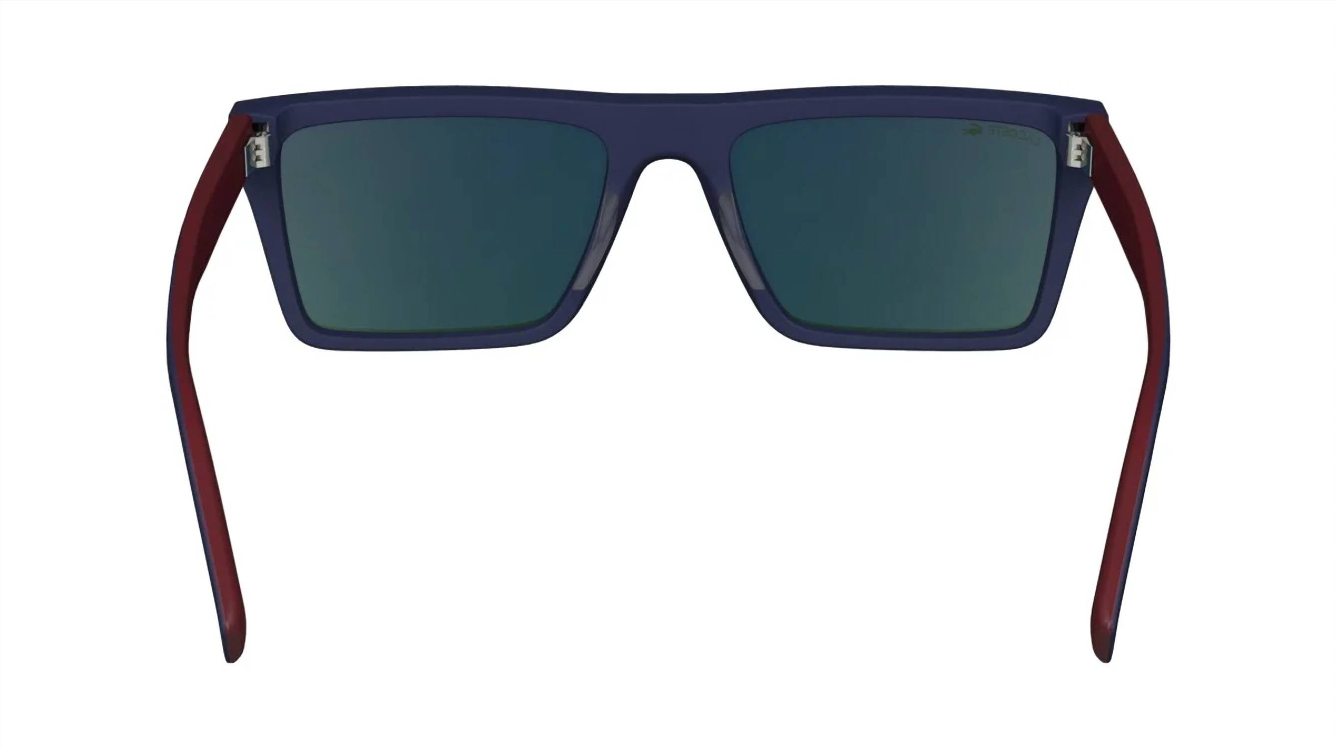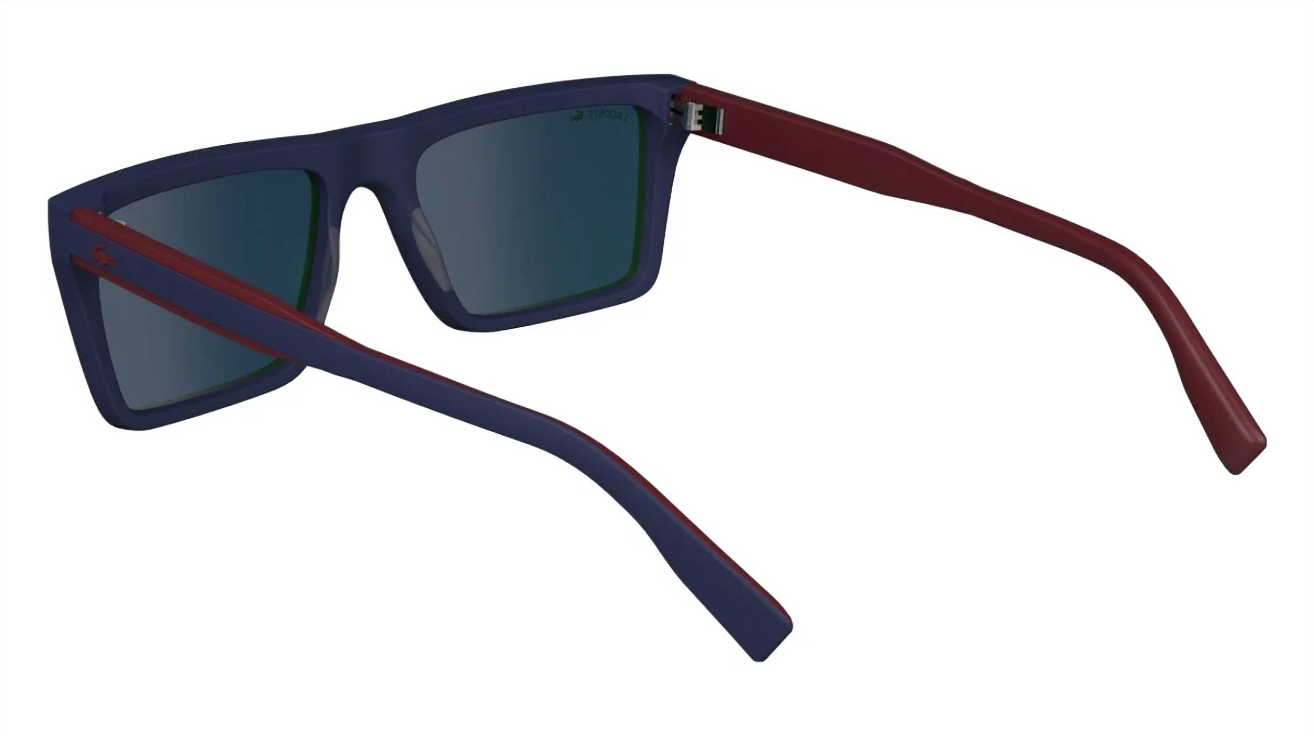 Introducing the Men's L6009s Sunglasses by Lacoste, a stylish choice for any modern wardrobe. With a matte blue full rim frame crafted from durable plastic, these sunglasses boast a rectangle shape that's ideal for heart, oval, and round face shapes. They feature a lens width of 56 mm, bridge width of 19 mm, and a temple length of 145 mm, with violet plastic lenses offering Category 3 UV protection. Perfect for those seeking both form and function in their eyewear.