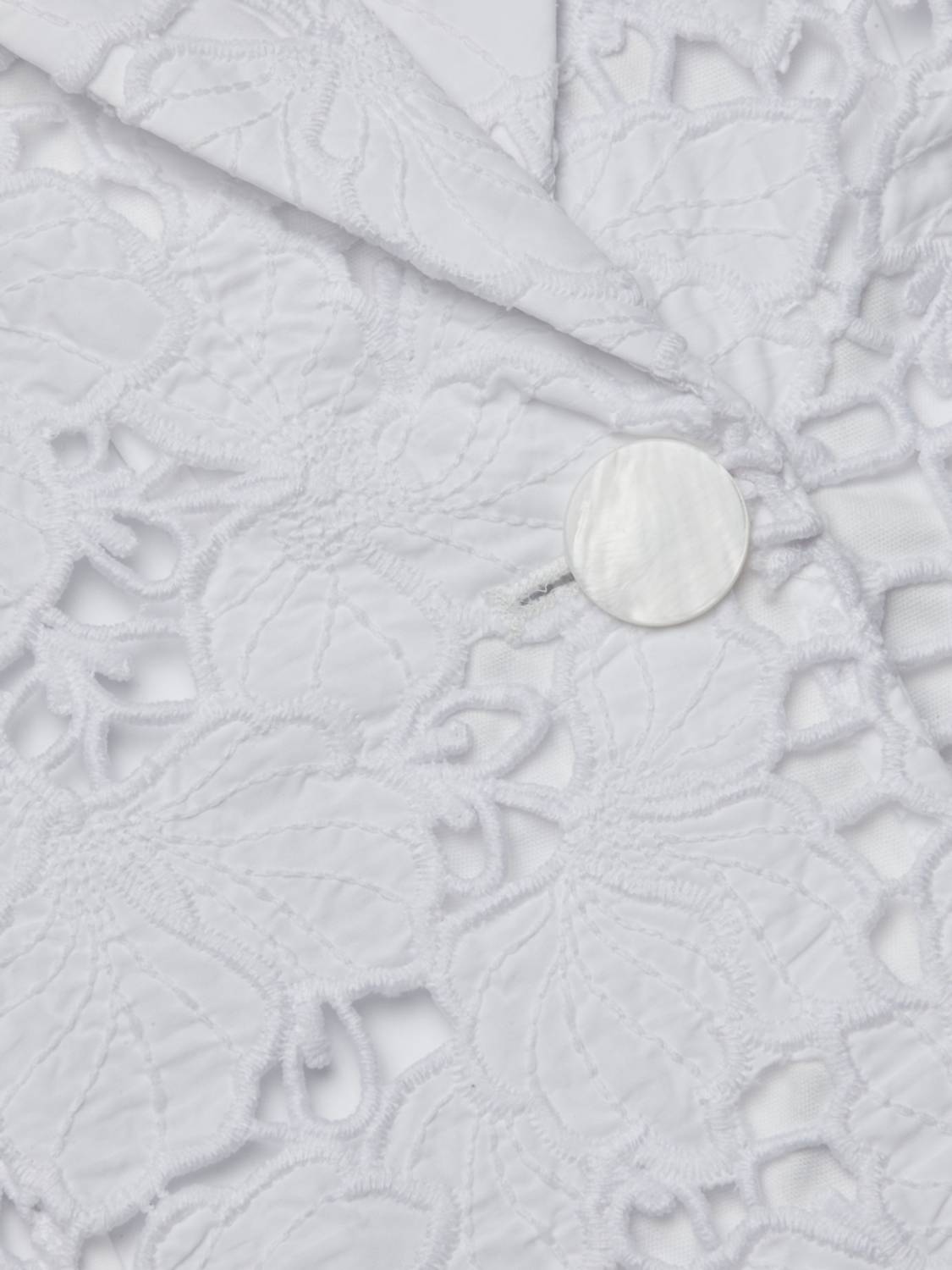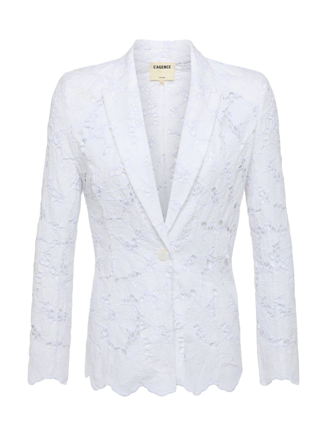 Tailored to perfection, this blazer will be your go-to jacket for years to come. The Clementine Lace Blazer by L'Agence offers a stunning take on the classic single-breasted blazer in a luxurious white lace. It features long sleeves made from 100% cotton eyelet poplin, providing a textured elegance perfect for any occasion. With a button closure and a length of approximately 26.5 inches from shoulder to hem, this blazer pairs sophistication with comfort. Crafted for quiet luxury, it's imported and requires dry cleaning only. Model is 5'10", with dimensions 32" bust, 24" waist, 34.5" hips, and wears size 2. Sleeve length is 24.3 inches.