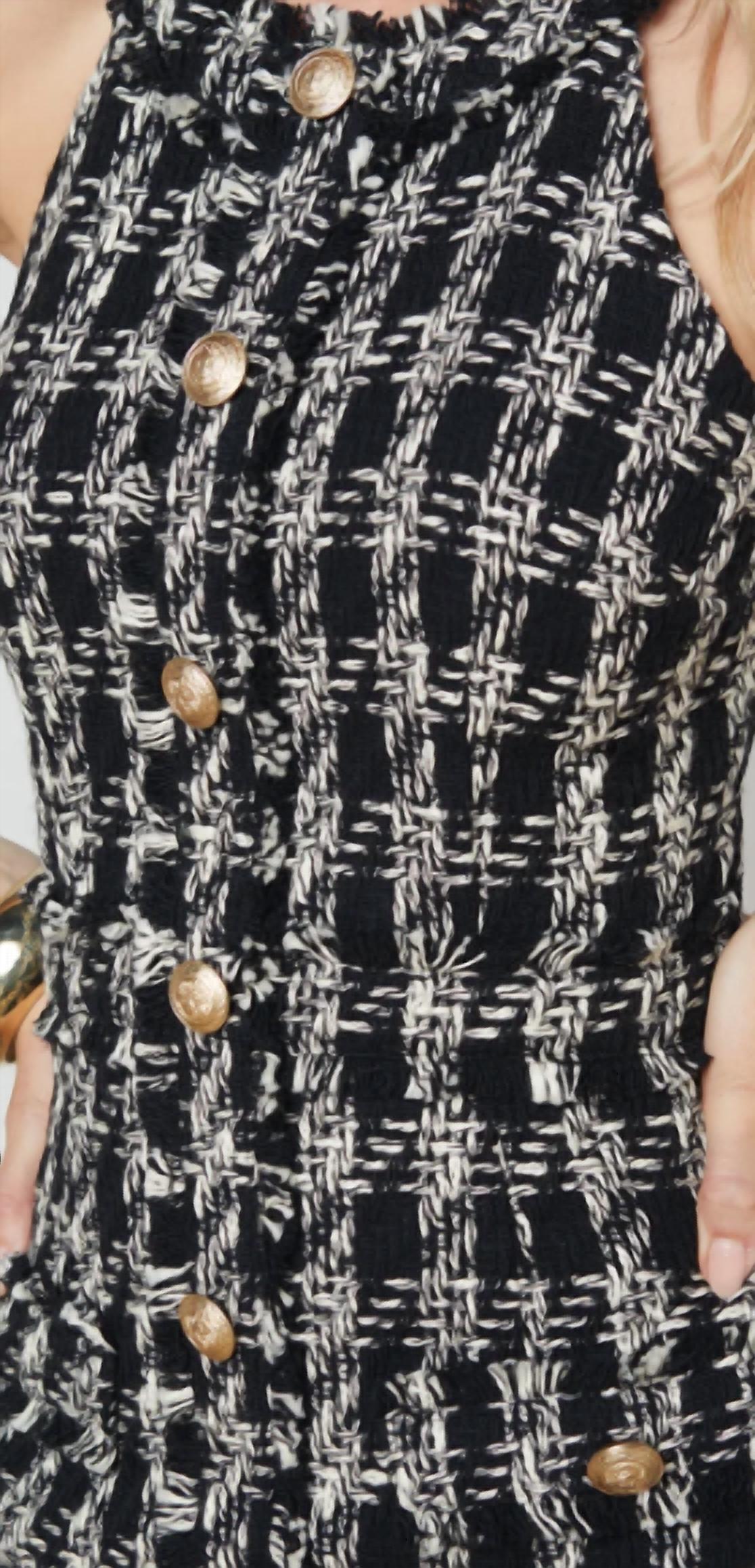 A short and breezy dress for those warmer days.Fits true to size, order your normal size. Fitted at the bust, waist, and hips. Designed to hit above the knees. Round neck with fringed trim. Sleeveless, cut-in shoulders. Front faux button placket. Back concealed zip closure. Fringed waistband. Two faux side patch pockets. Fringed hem. 72% viscose, 28% polyester. Hand wash or dry clean.