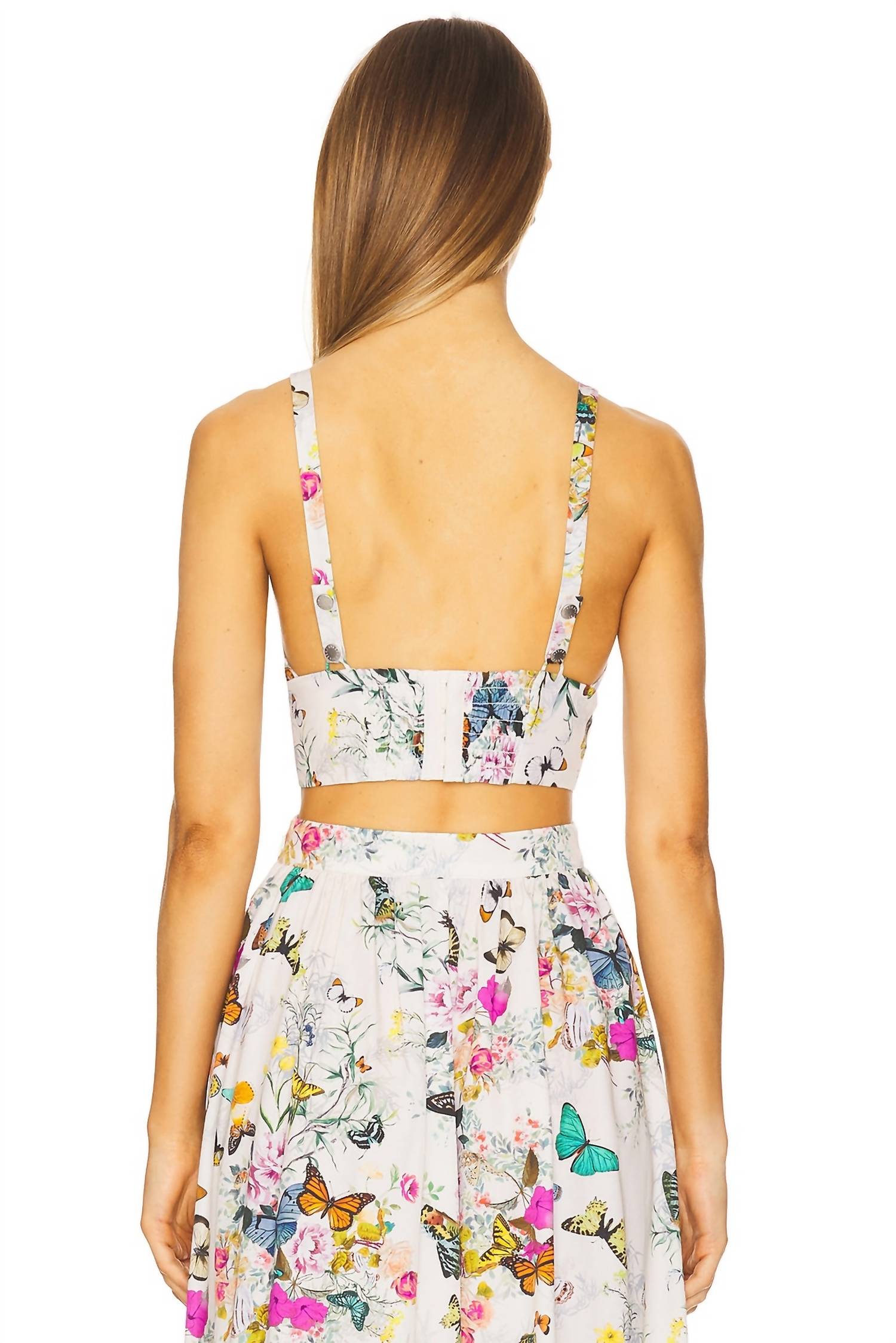 Pair this crop top with your favorite high-waisted jeans or maxi skirt. Discover the Kaori Bralette by L'Agence, a charming addition in a white Charonda butterfly print. This sleeveless, cropped style bralette features a flattering V-neck and is composed of 62.2% lyocell and 37.8% cotton with a lining of 100% cotton. Closure: Hook-and-eye closures with smocked elastic at the back, plus hook and loop closures and adjustable straps with snap button closures for the perfect fit. Care: Machine wash in cold water. Imported. Garment length: 14.25".