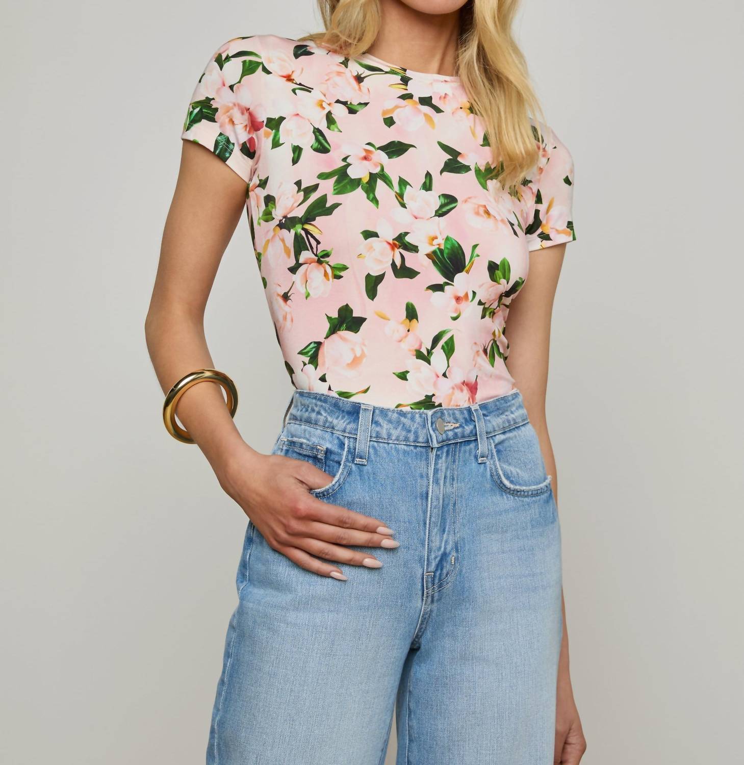 The short sleeve tee you'll want in every color. The L'Agence Ressi Fitted Short Sleeve Tee in Magnolia Floral is the ultimate spring essential for your wardrobe. Crafted from ultra-soft jersey, this tee boasts a slim cut and a flattering crew neck. Measurements include a sleeve length of 5.25 inches, with the overall garment measuring about 24.75 inches from shoulder to hem. Made for ease and comfort, it features a pull-on closure and is machine washable and tumble dry friendly.