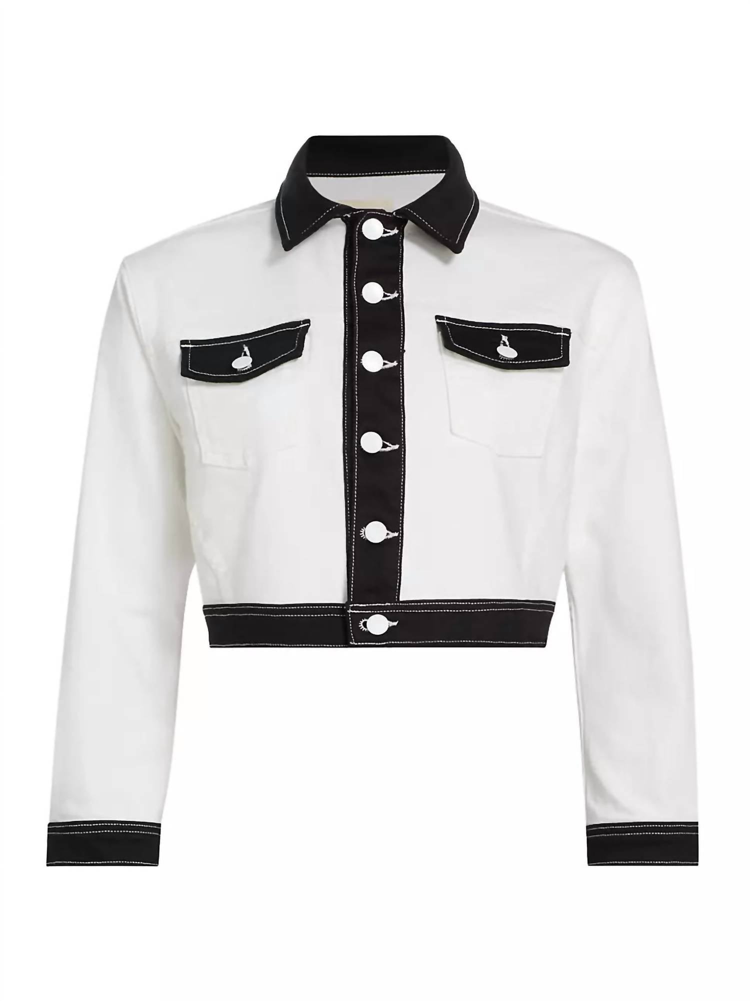 Pair this crop top with your favorite high-waisted jeans or maxi skirt. Elevate your vacation wardrobe with the Women's Koda Colorblock Top by L'Agence, a stylish piece featuring long sleeves and a trendy cropped cut. Crafted in solid denim, its bold black-and-white colorblocking adds a touch of modern sophistication. This top comes equipped with functional flap patch pockets and a classic collar, secured with a button closure for that timeless jean-jacket feel. Perfect for pairing with black or white denim, pants, or skirts, it promises versatility and effortless chic for your spring streetwear looks.