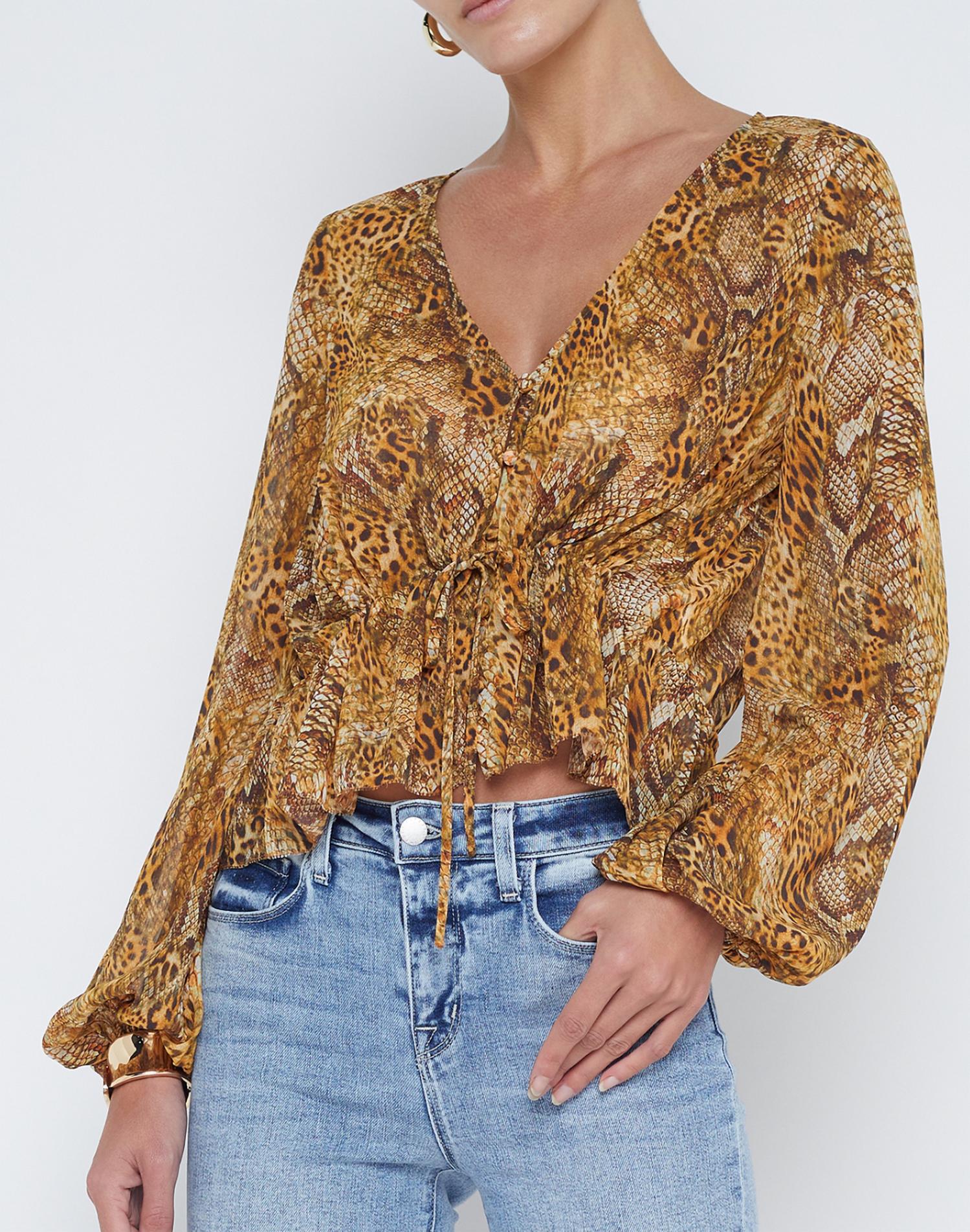 Pair this with your favorite jeans and slides for your next girls night out. The Women's Pixie Drawstring Blouse by L'Agence is a chic addition to any wardrobe, featuring a vibrant yellow hue adorned with an animal pattern. Designed with long sleeves and a trendy V-neck, this blouse offers a comfortable yet stylish look. The button closure ensures ease of wear, while the care instructions recommend machine washing and laying flat to dry to maintain its quality. Perfectly blending elegance with functionality, this blouse is a must-have for fashion-forward women.