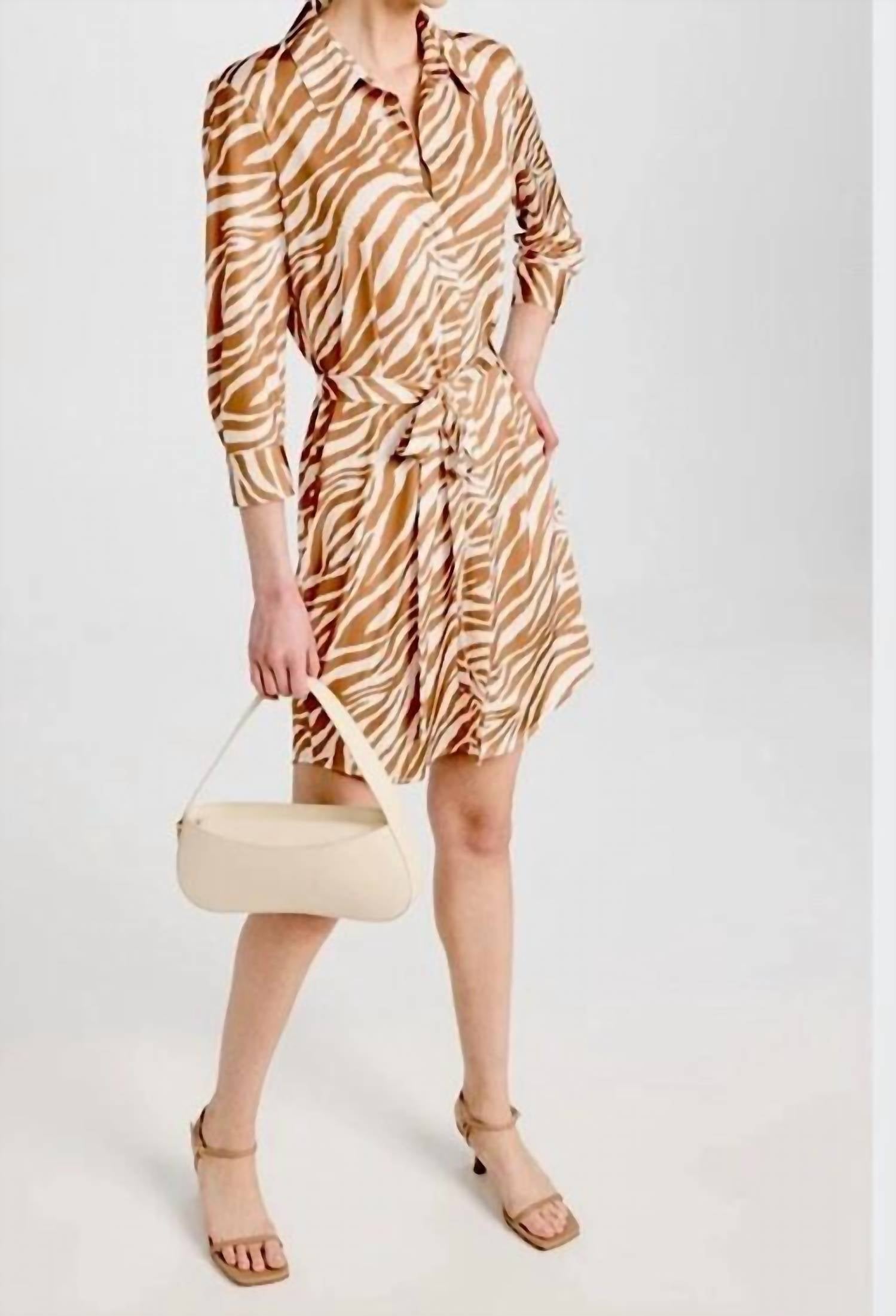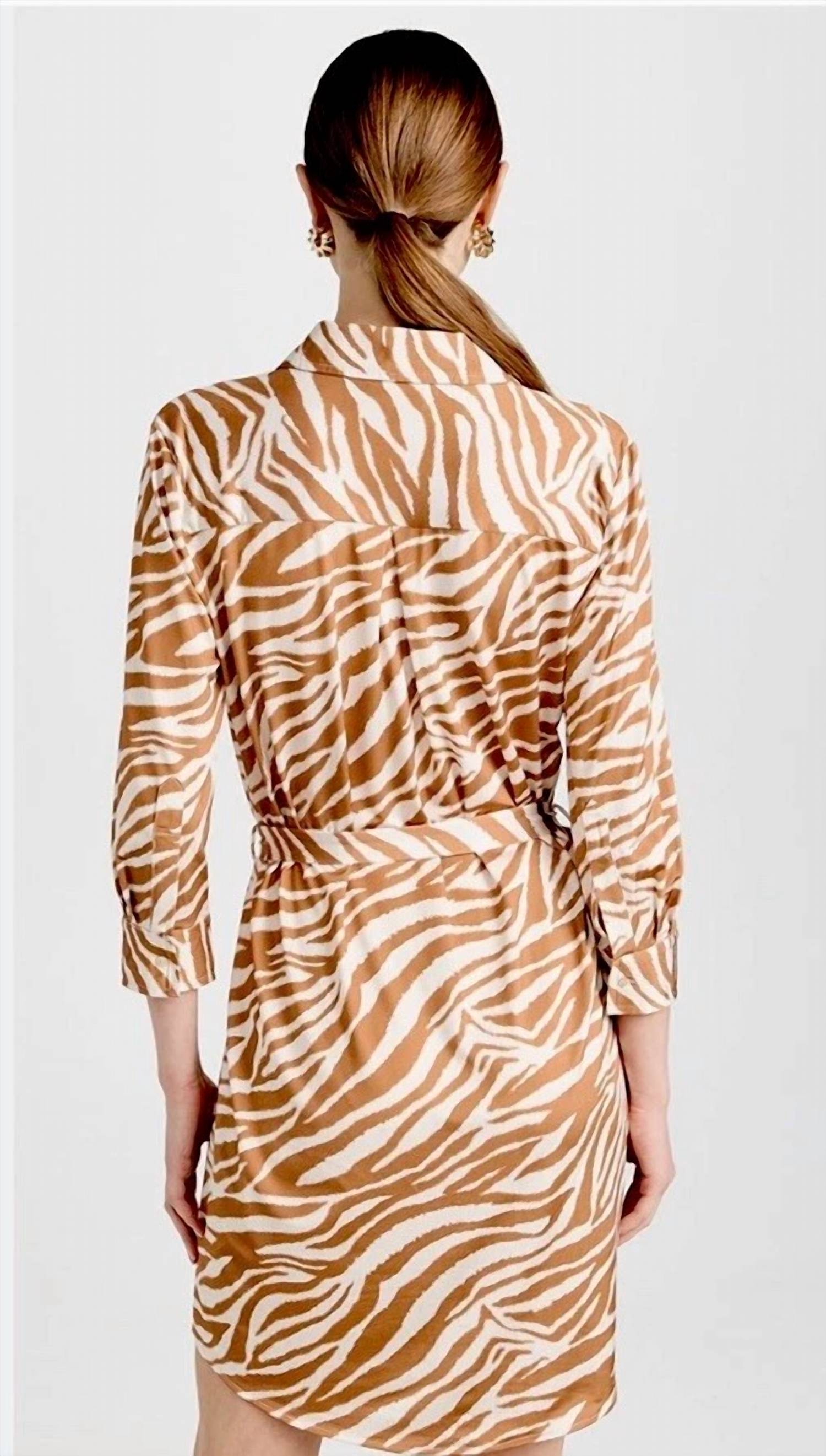 Introducing the Żebra Print Shirt Dress by L'Agence, a stylish choice for any dinner party or Mother's Day celebration. With three-quarter sleeves and a classic collar, this dress is crafted from 90% Polyester and 10% Spandex, offering a comfortable fit and vintage appeal. Designed in a mini silhouette, it flaunts an eye-catching animal pattern in shades of brown and cream. Closure: Button closure. Care: Dry clean only.