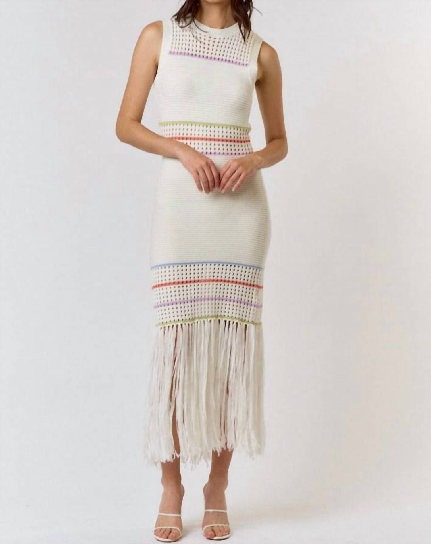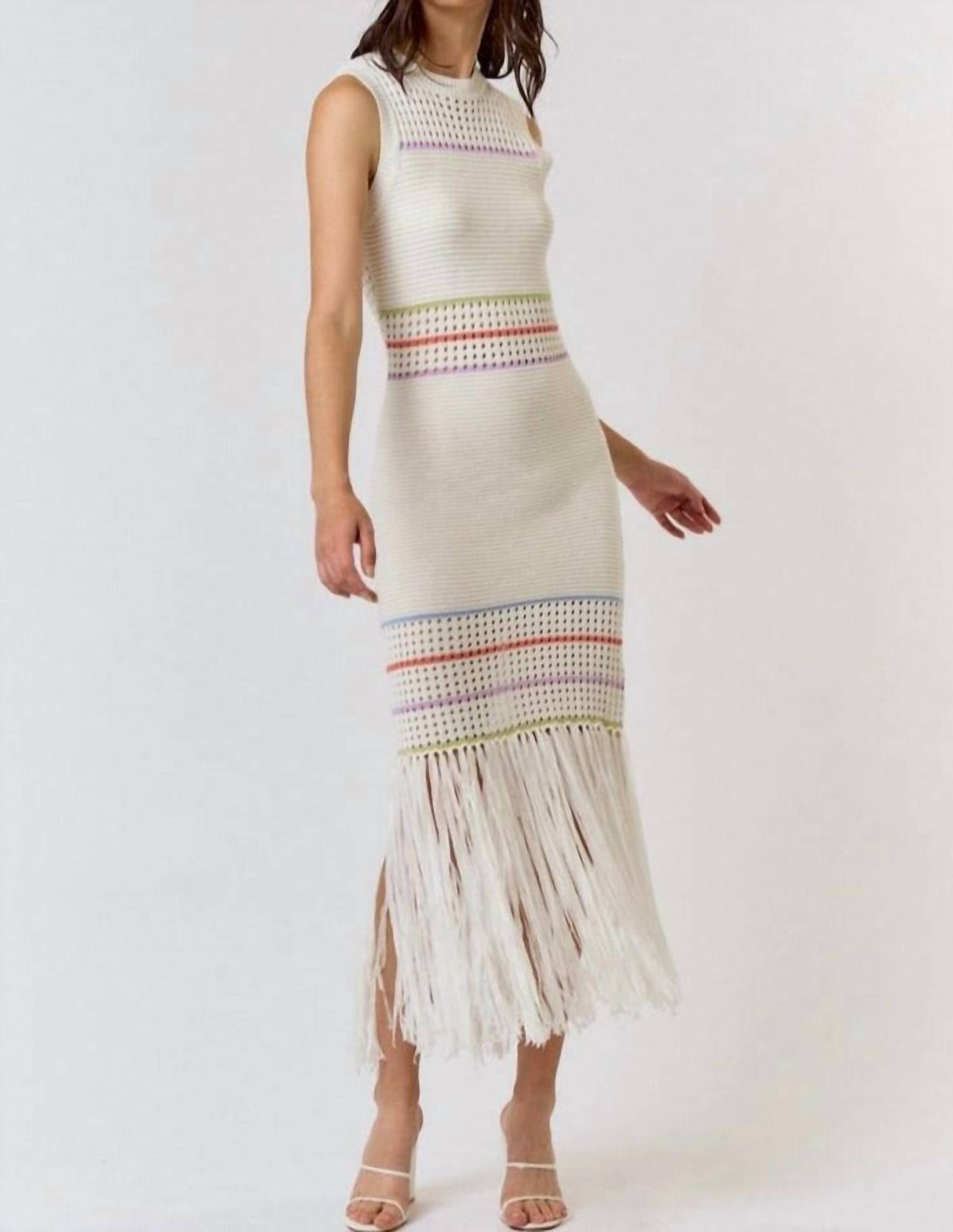 Who doesn't love a good maxi dress? This one you'll be reaching for season after season. The Striped Knit Maxi Dress by Lalavon is an exquisite choice for those seeking comfort with style. This sleeveless bodycon dress is crafted from a breathable 60% cotton and 40% acrylic blend, styled with a textured knit pattern and playful fringe detail on the hemline for added flair. Designed with a pull-on closure and a crewneck for easy wear, this maxi-length piece is perfect for a spring dinner party or Easter celebration. Care for the dress by machine washing and laying flat to dry to maintain its quality and fit.